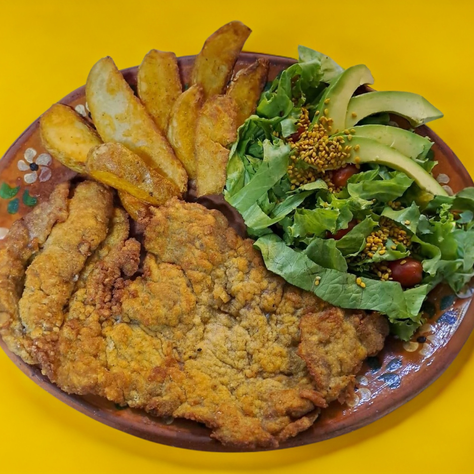 Acompañados de {frijoles, cebollitas y nopales} o {ensalada con lechuga italiana, espinaca, manzana, semilla de girasol caramelizada, queso panela, arándano y aderezo italiano}