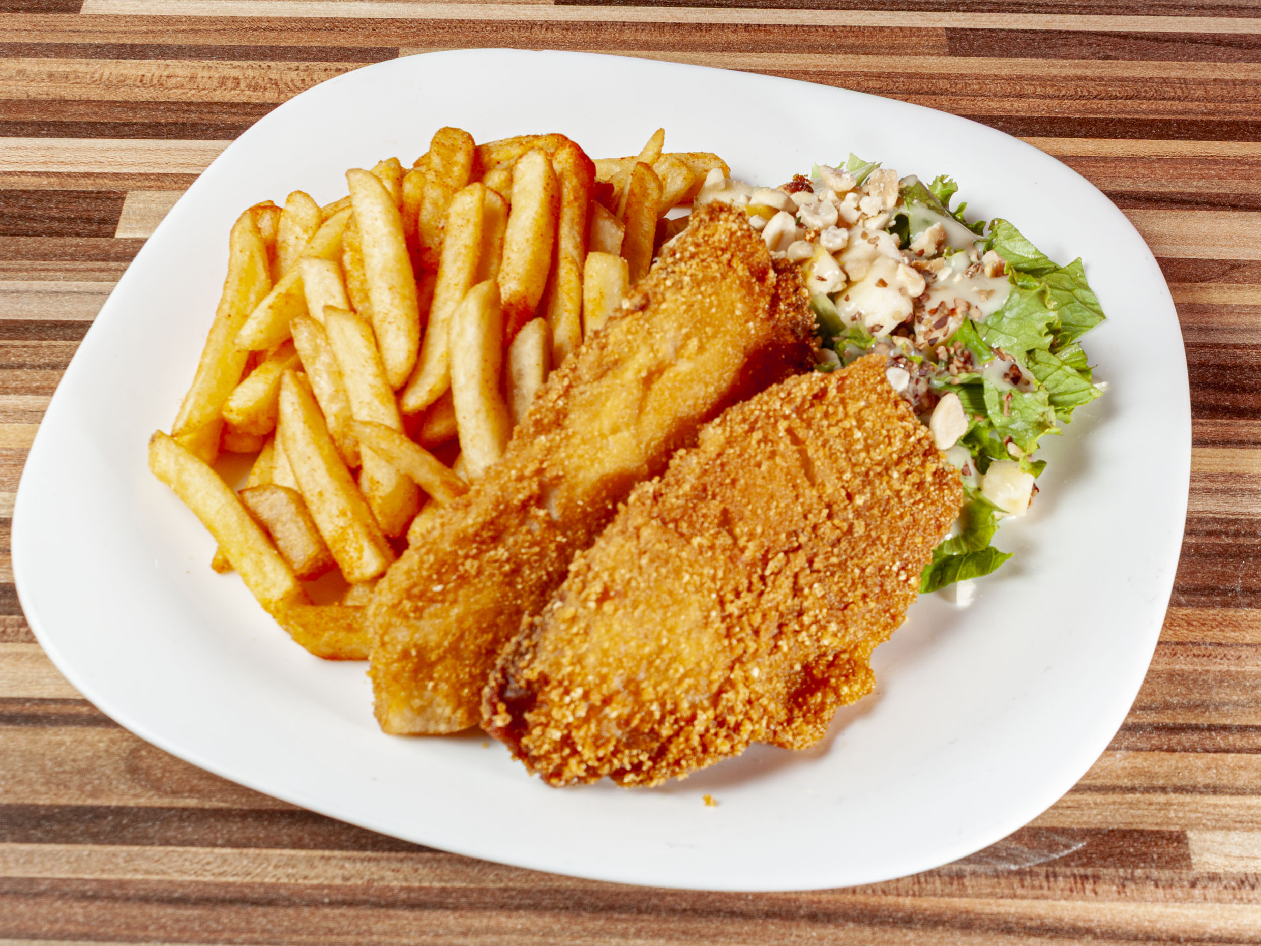 Pechuga empanizada con cereal y amaranto, rellena de queso amarillo, queso Oaxaca, jamón, acompañada de ensalada campesina.