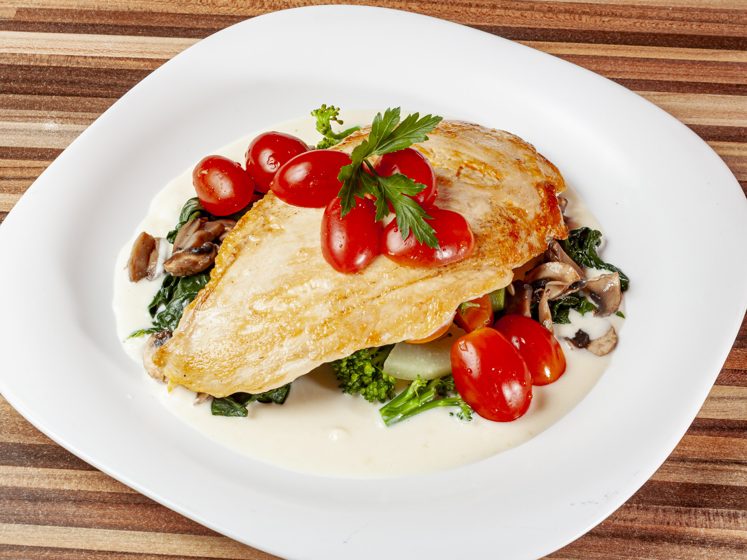 Pechuga asada sobre una deliciosa cama cremosa de queso, espinaca cocida, champiñones asados y cubitos de jitomate.
