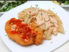 Pechuga empanizada gratinada con salsa de tomate acompañada con pasta al chipotle.