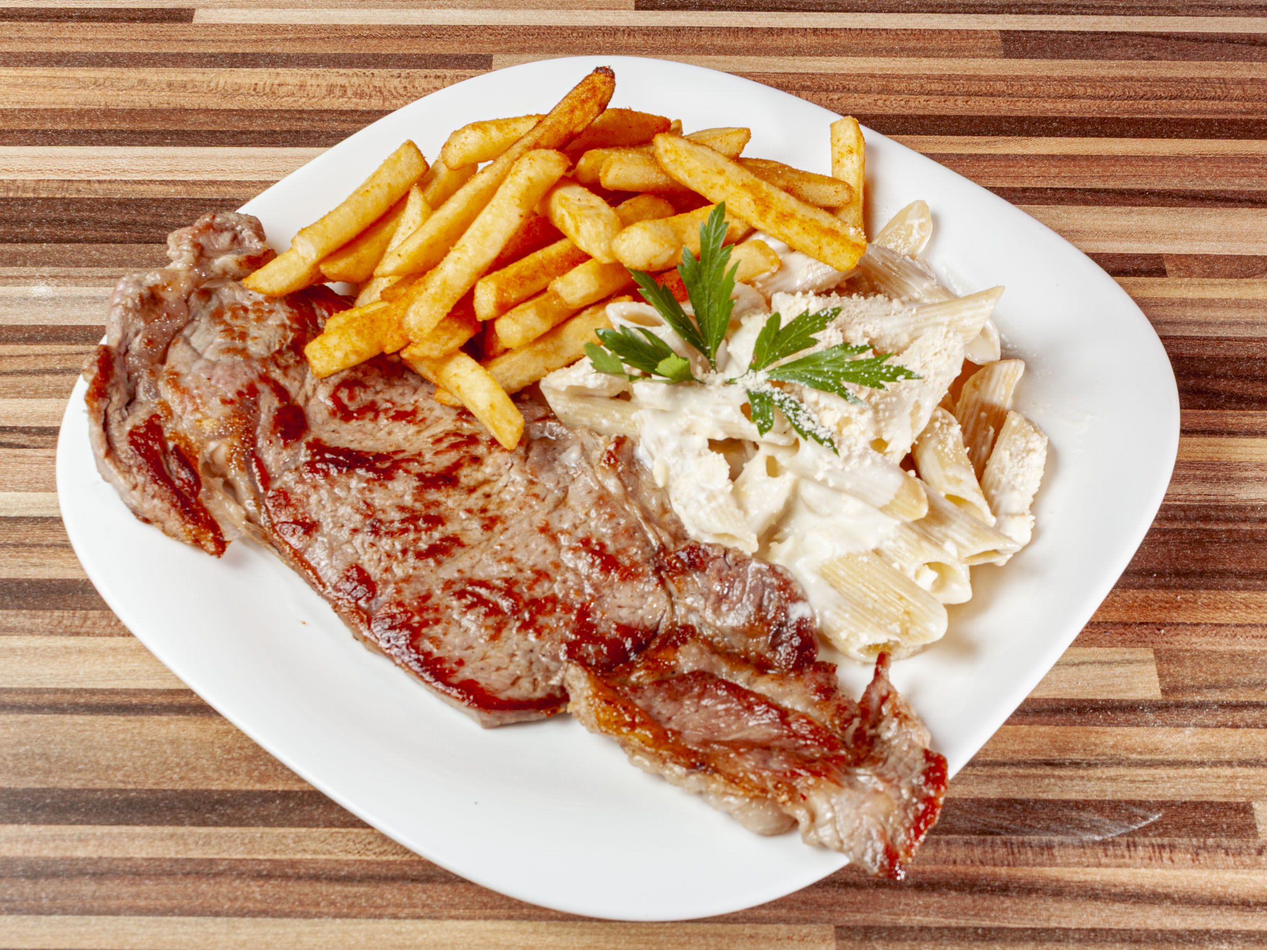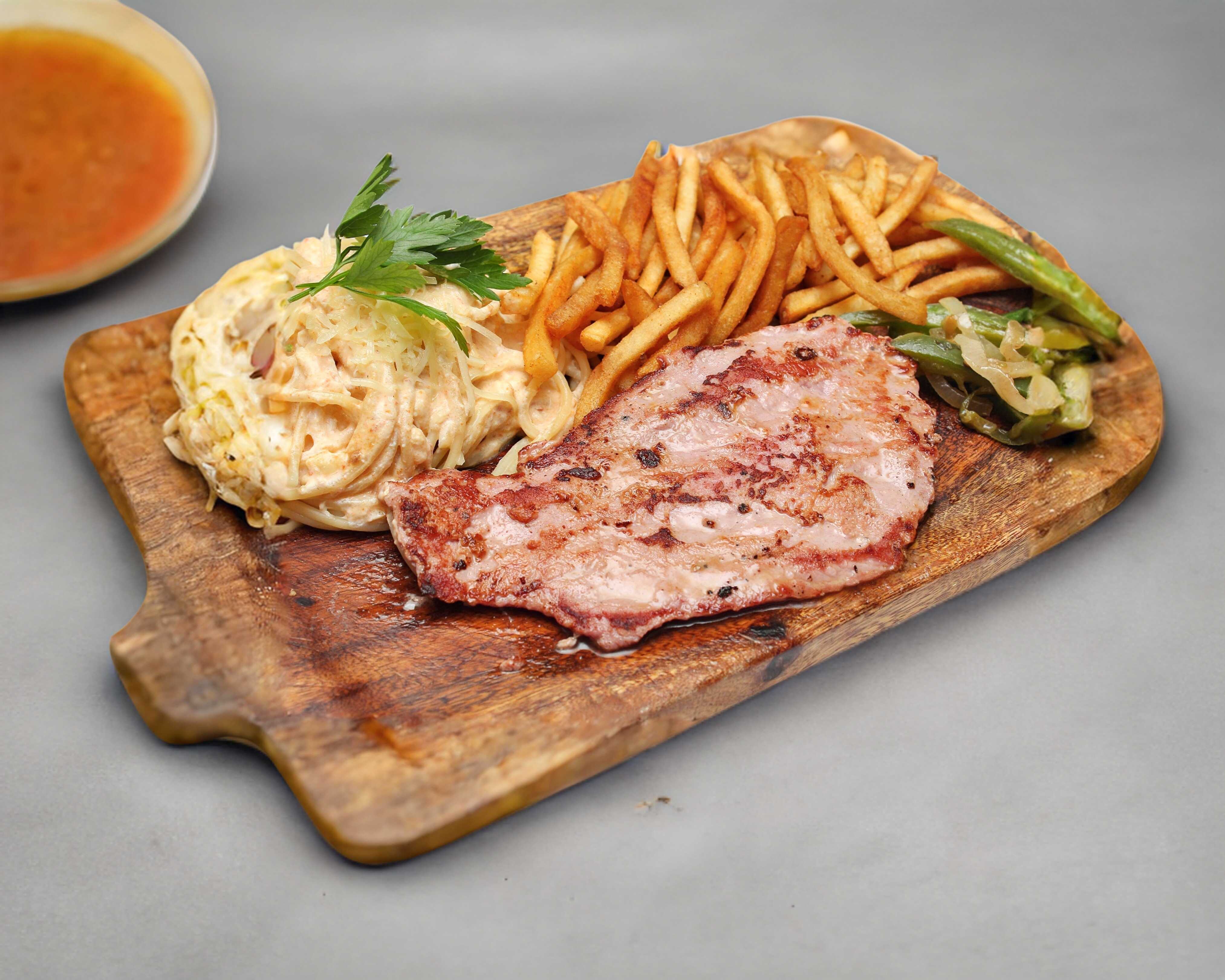 Corte americano suave y delicioso con una rica guarnición de papas a la francesa, pasta y chiles toreados.