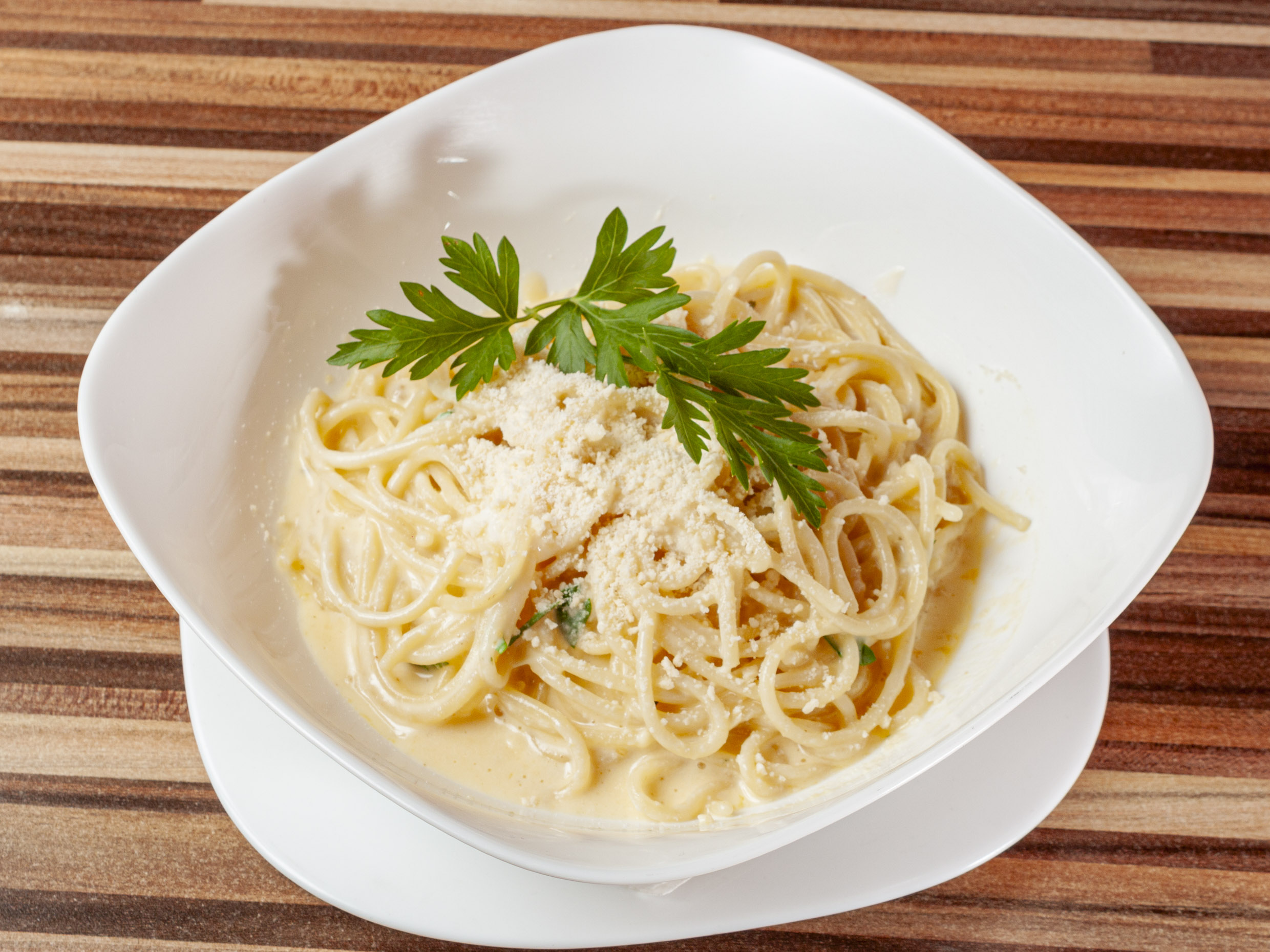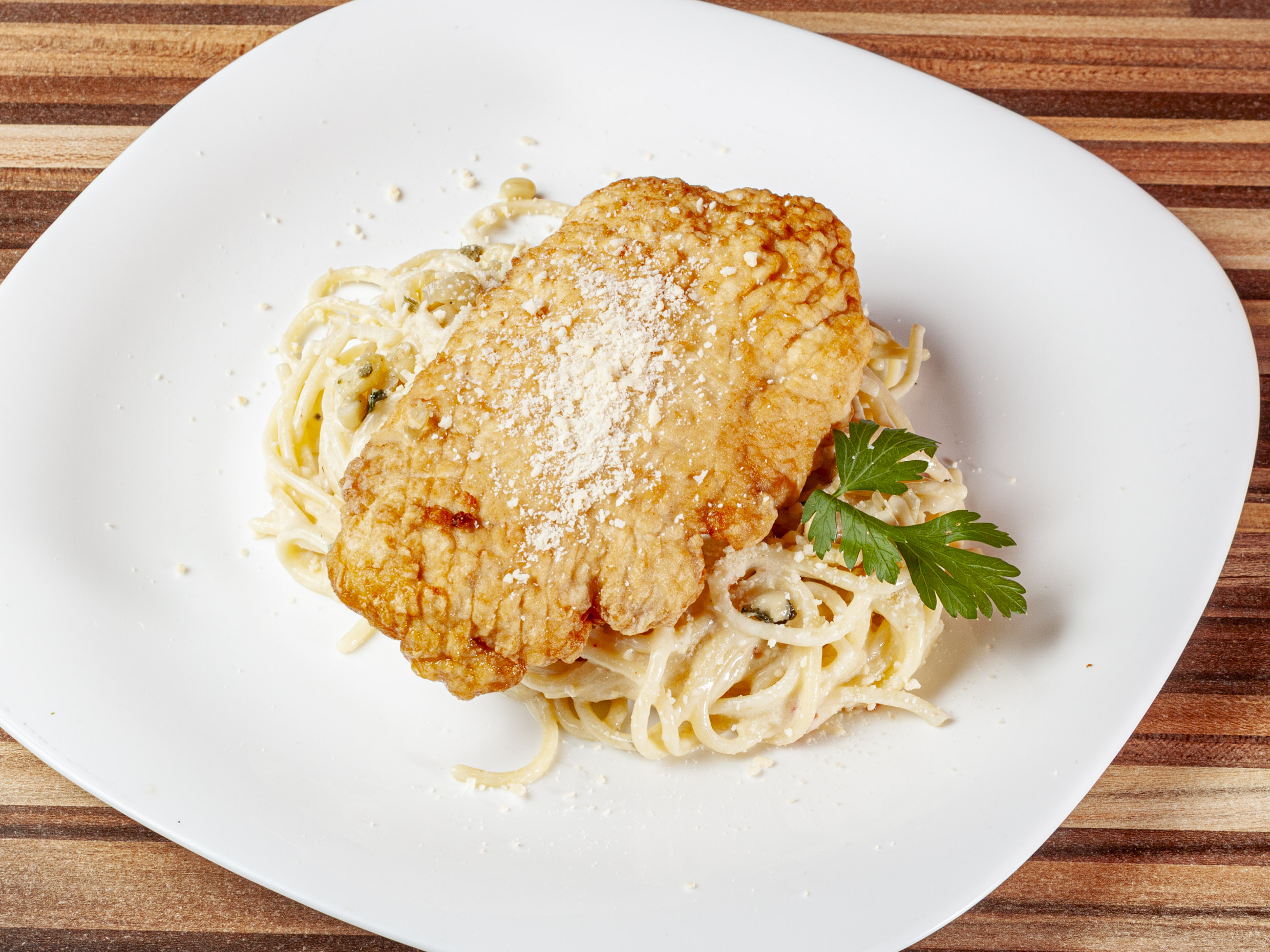 Pechuga rebosada, acompañada con spaghetti en salsa cremosa de elote y cebollino.