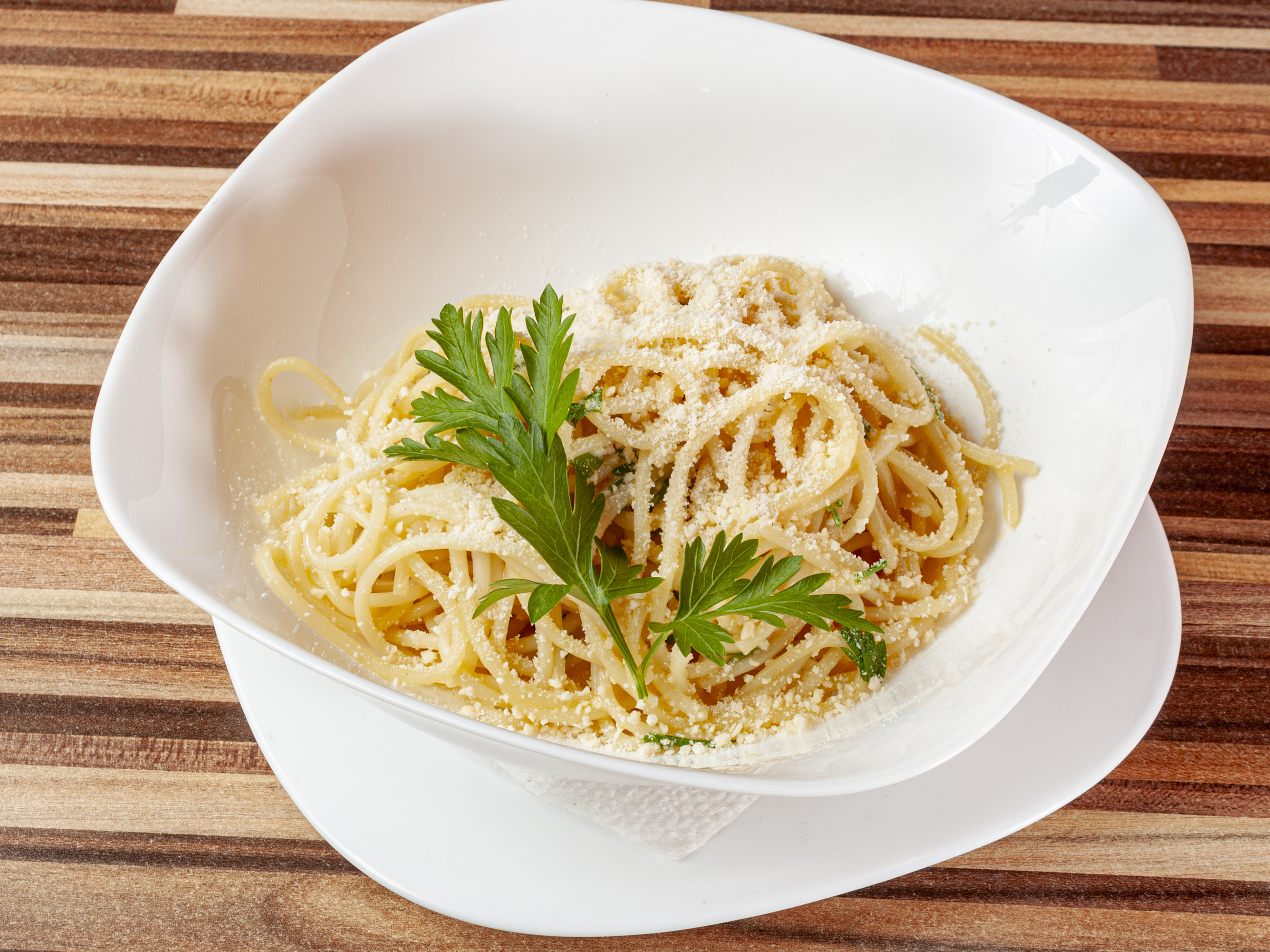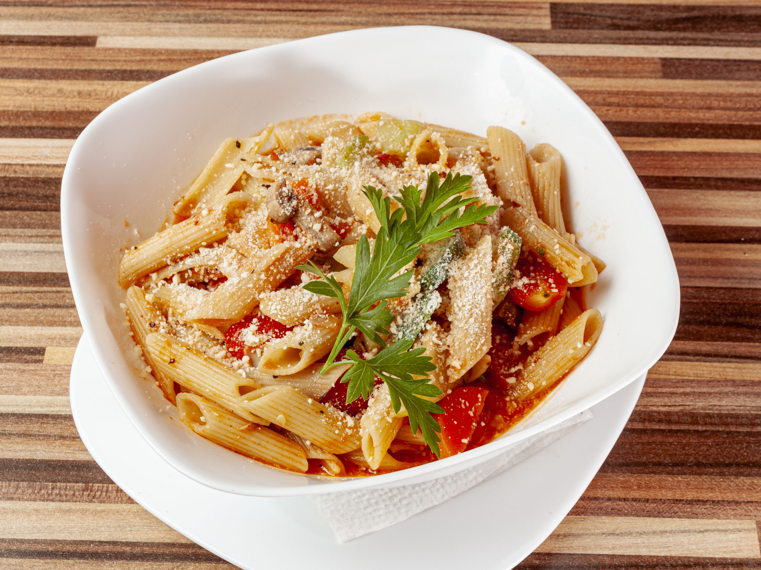 Combinación de vegetales frescos con salsa de tomate, mantequilla con pasta al dente y queso parmesano.