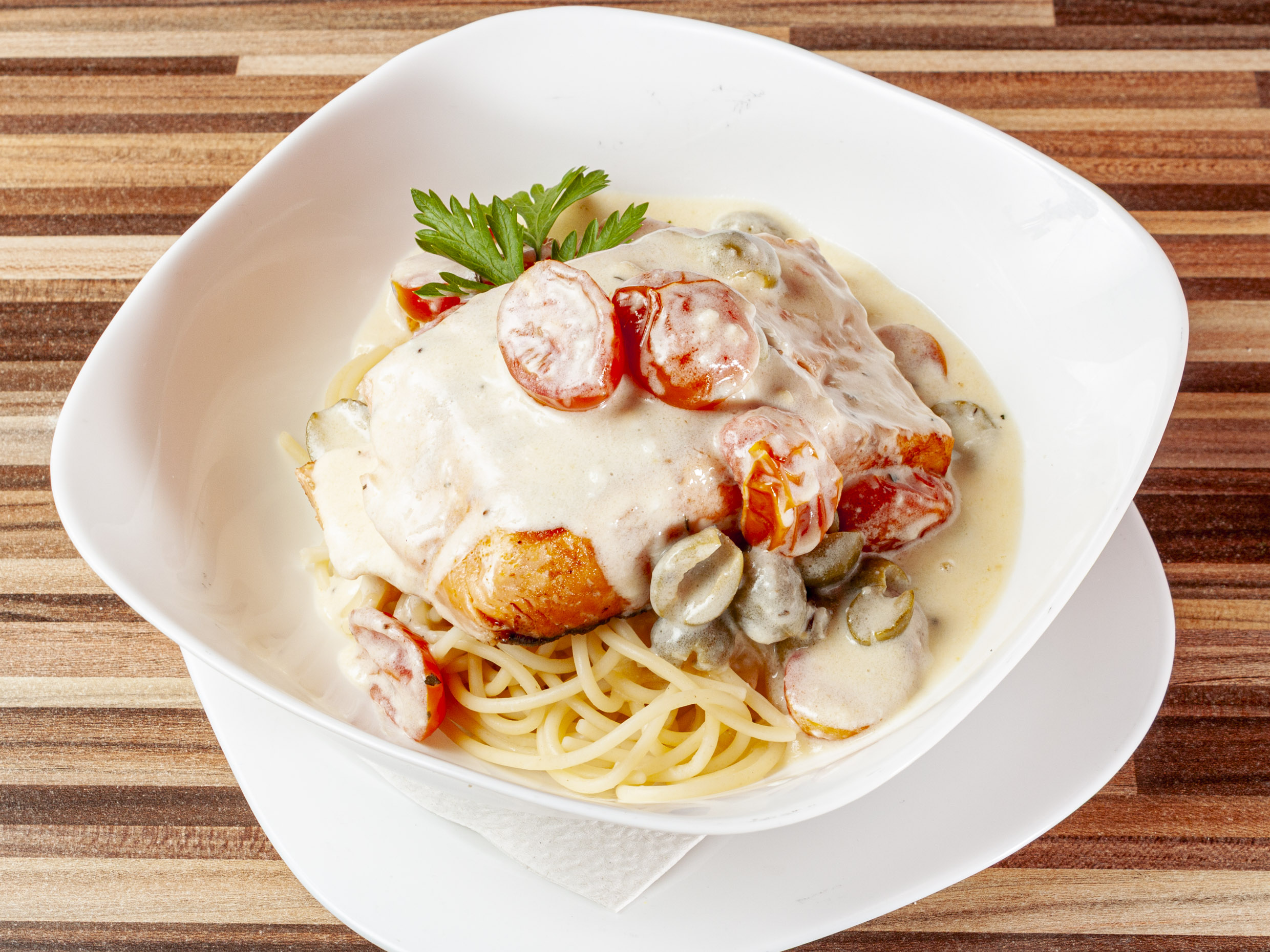 Salmón asado, servido sobre una cama de pasta, bañado con salsa cremosa, aceituna y cubitos de jitomate.
