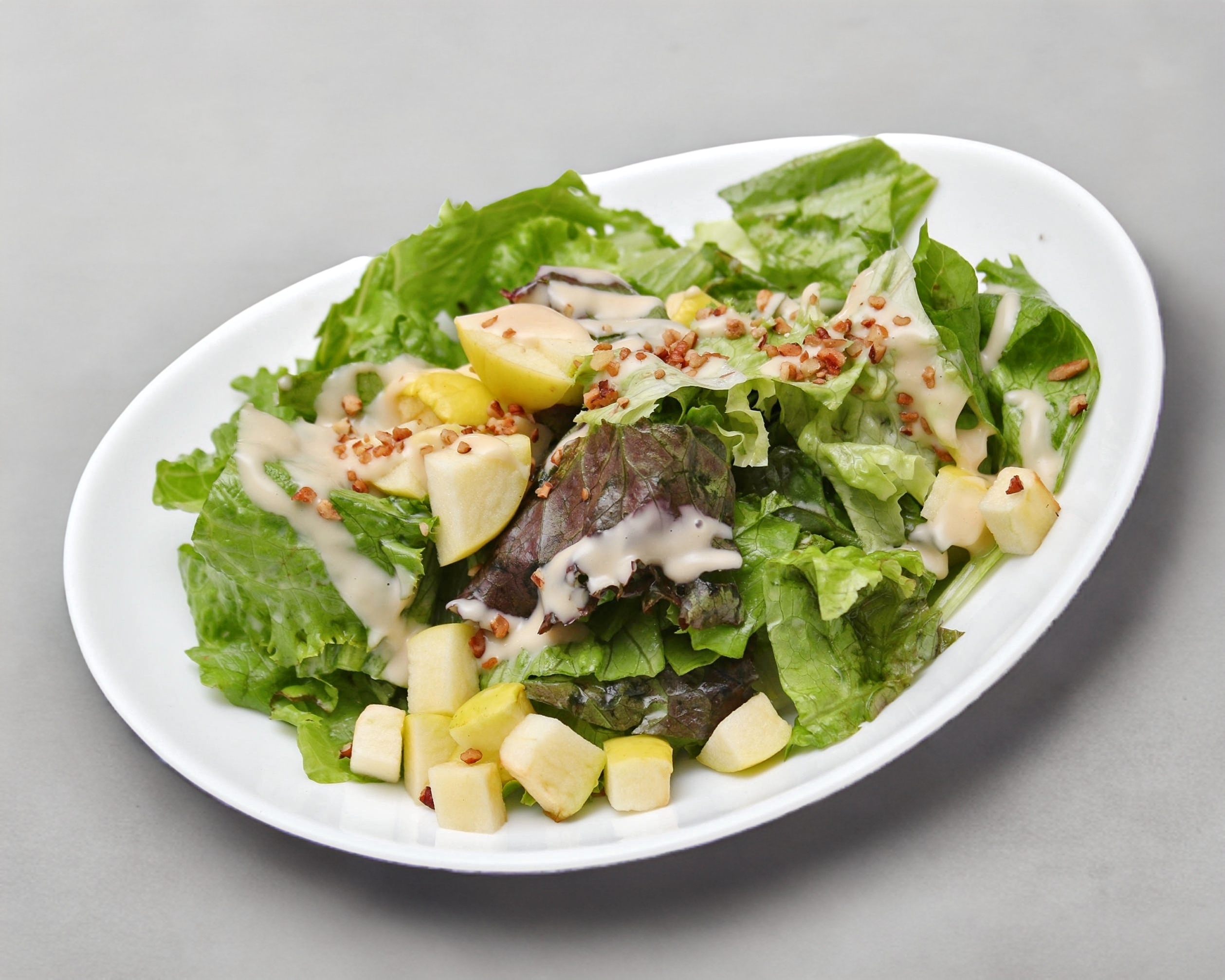 Tradicional ensalada de lechuga con aderezo a base de miel, cubitos de manzana espolvoreada con nuez horneada.