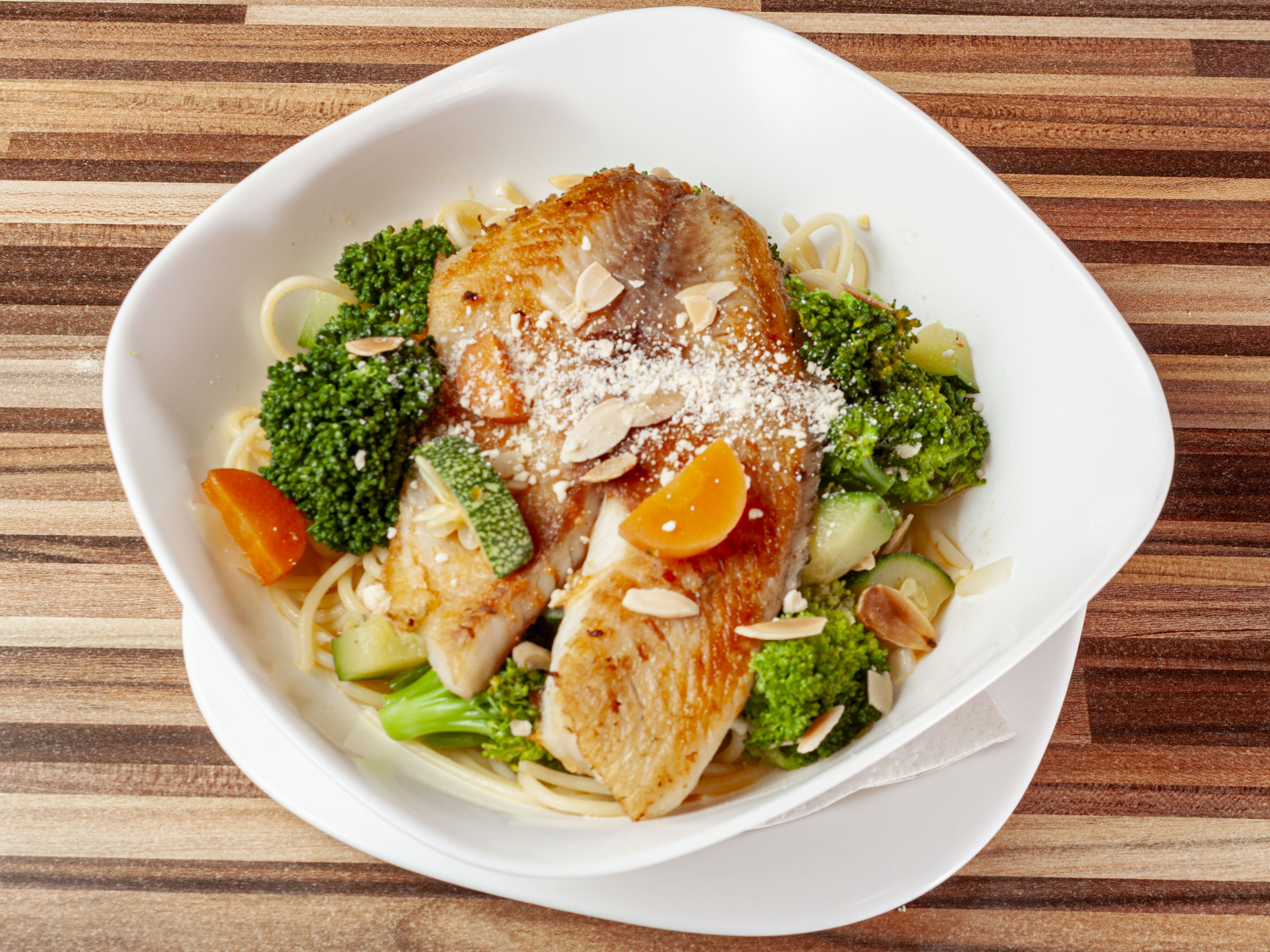 Pescado asado bañado en salsa a la mantequilla al limón con brócoli, papas cambray y almendras tostadas, sobre una cama de pasta el dente.