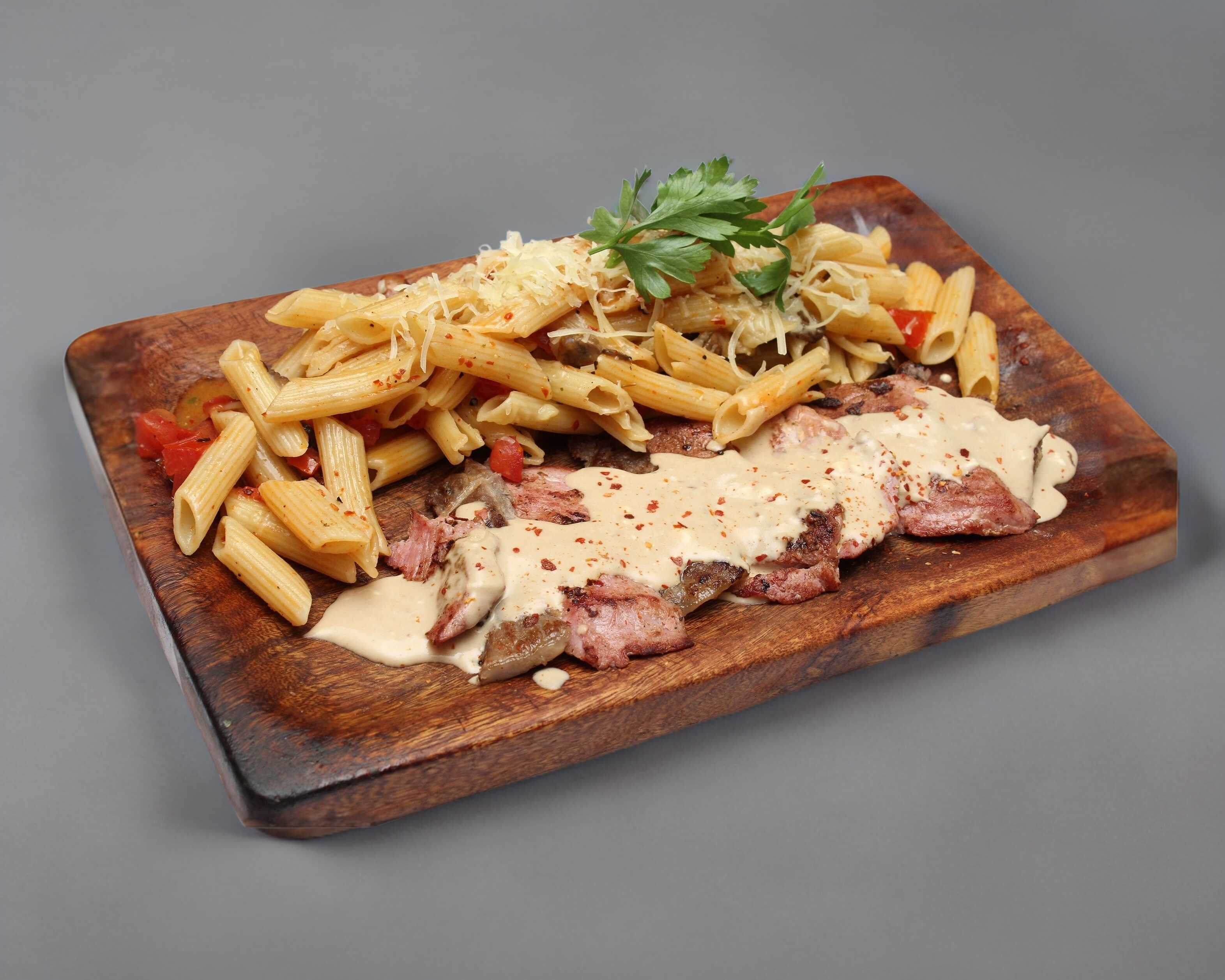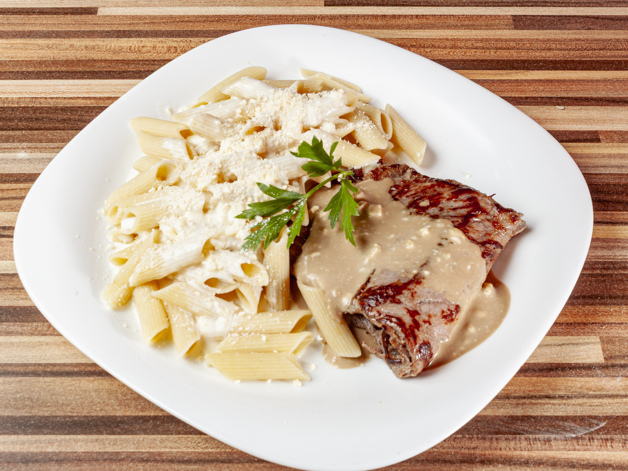 Carne de arrachera, rellena de jamón y queso, sobre una salsa chianty, acompañada de pasta cuatro quesos.
