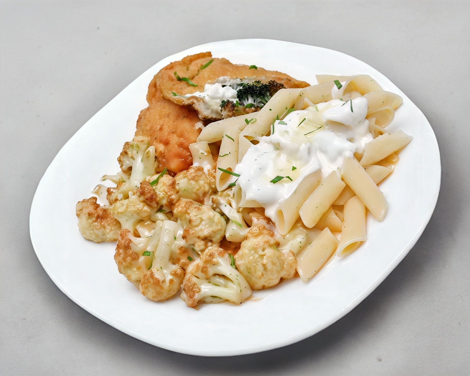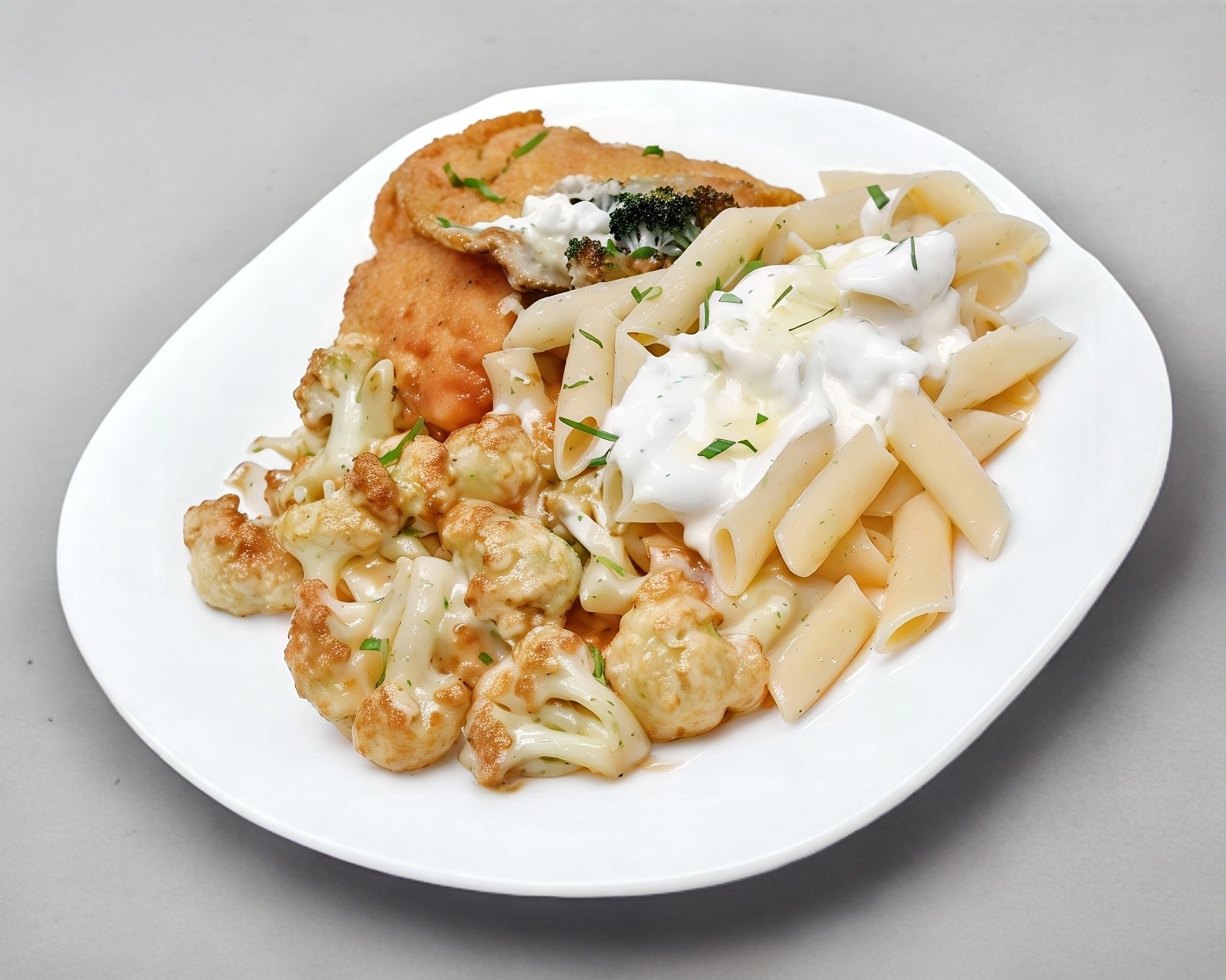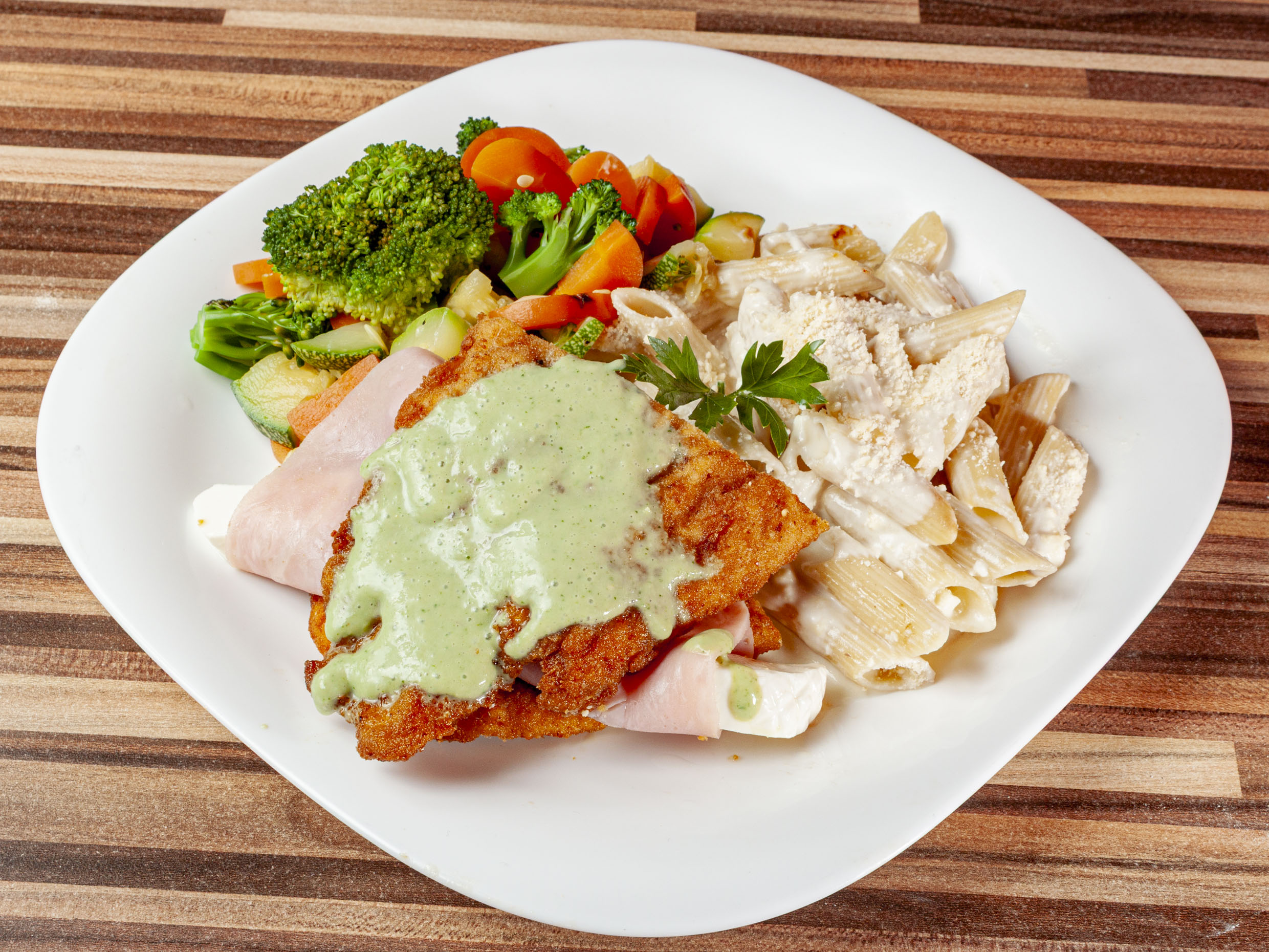 Pechuga empanizada rellena de jamón, queso mozzarella, bañada de salsa de cilantro con guarnición de verduras y pasta.
