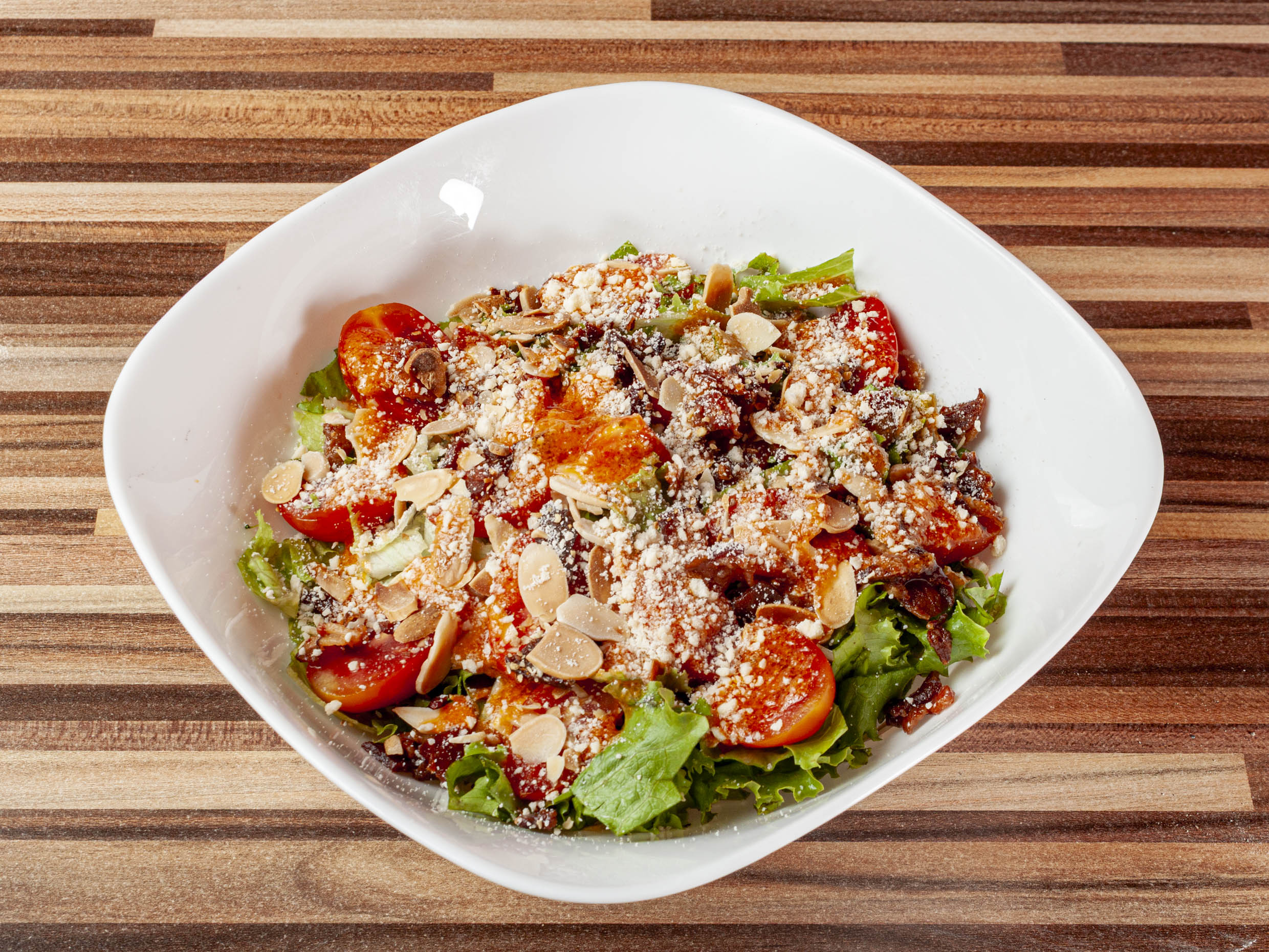 Combinación de lechugas con una rica vinagreta a base de pulpa de tamarindo con cubitos de jitomate, queso parmesano, hojuelas de almendras y tostadas con tocino al horno.