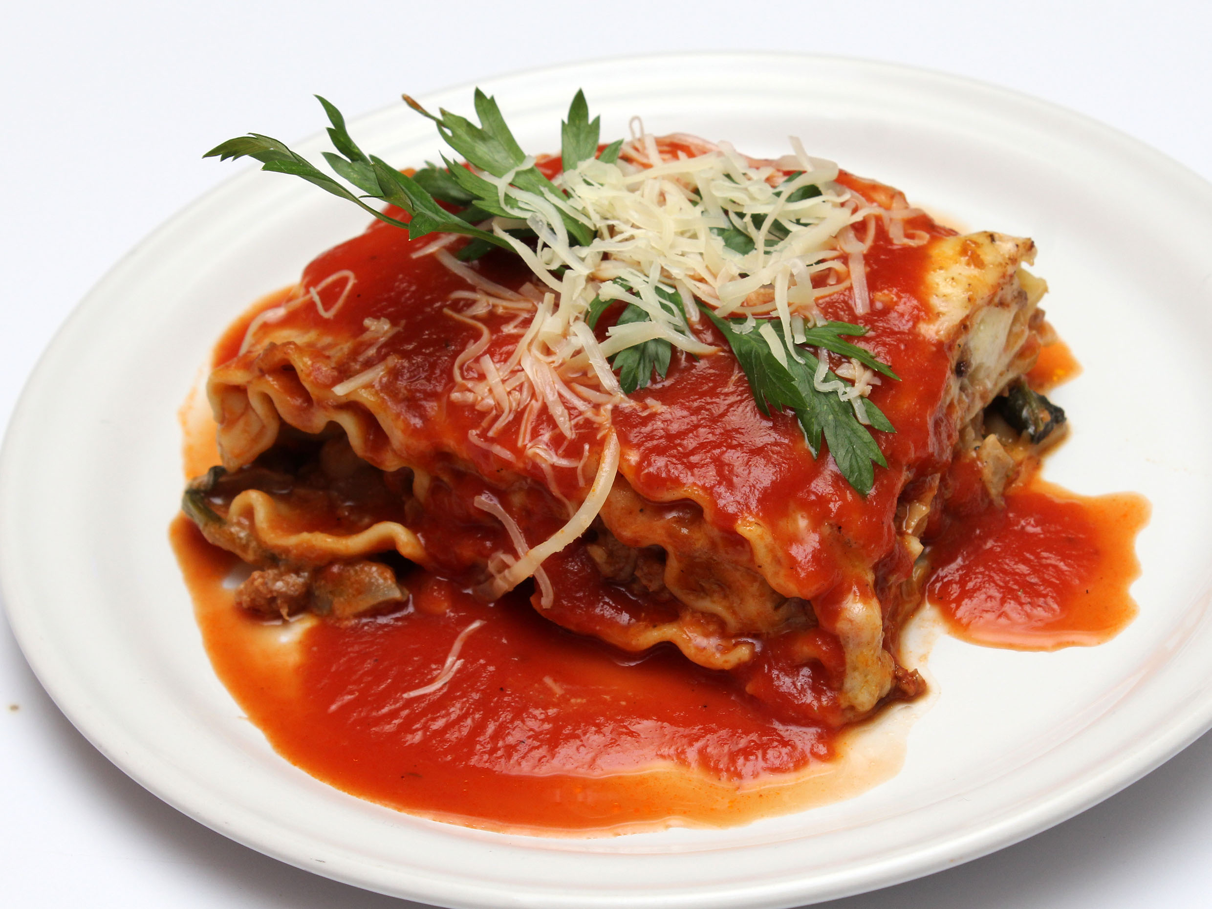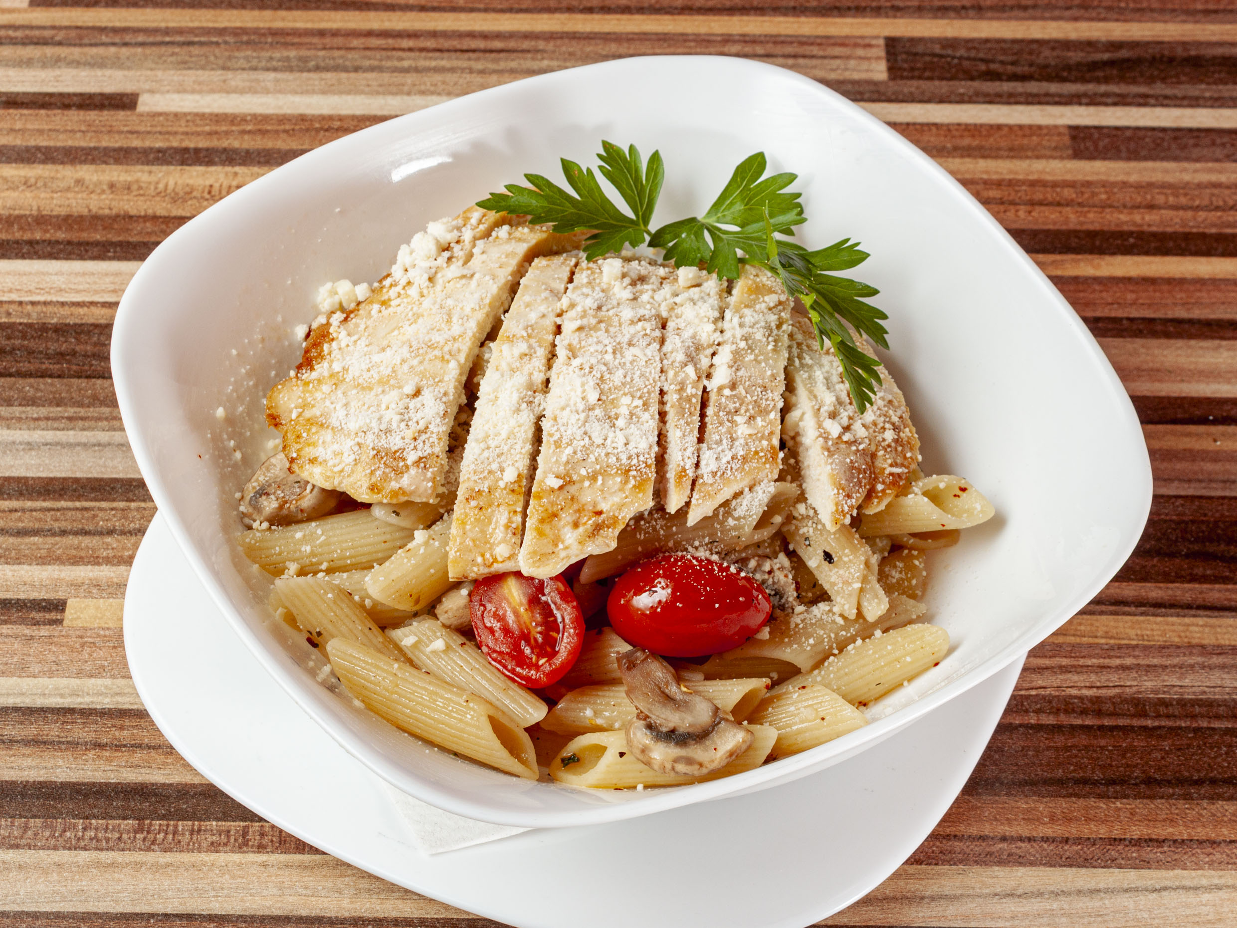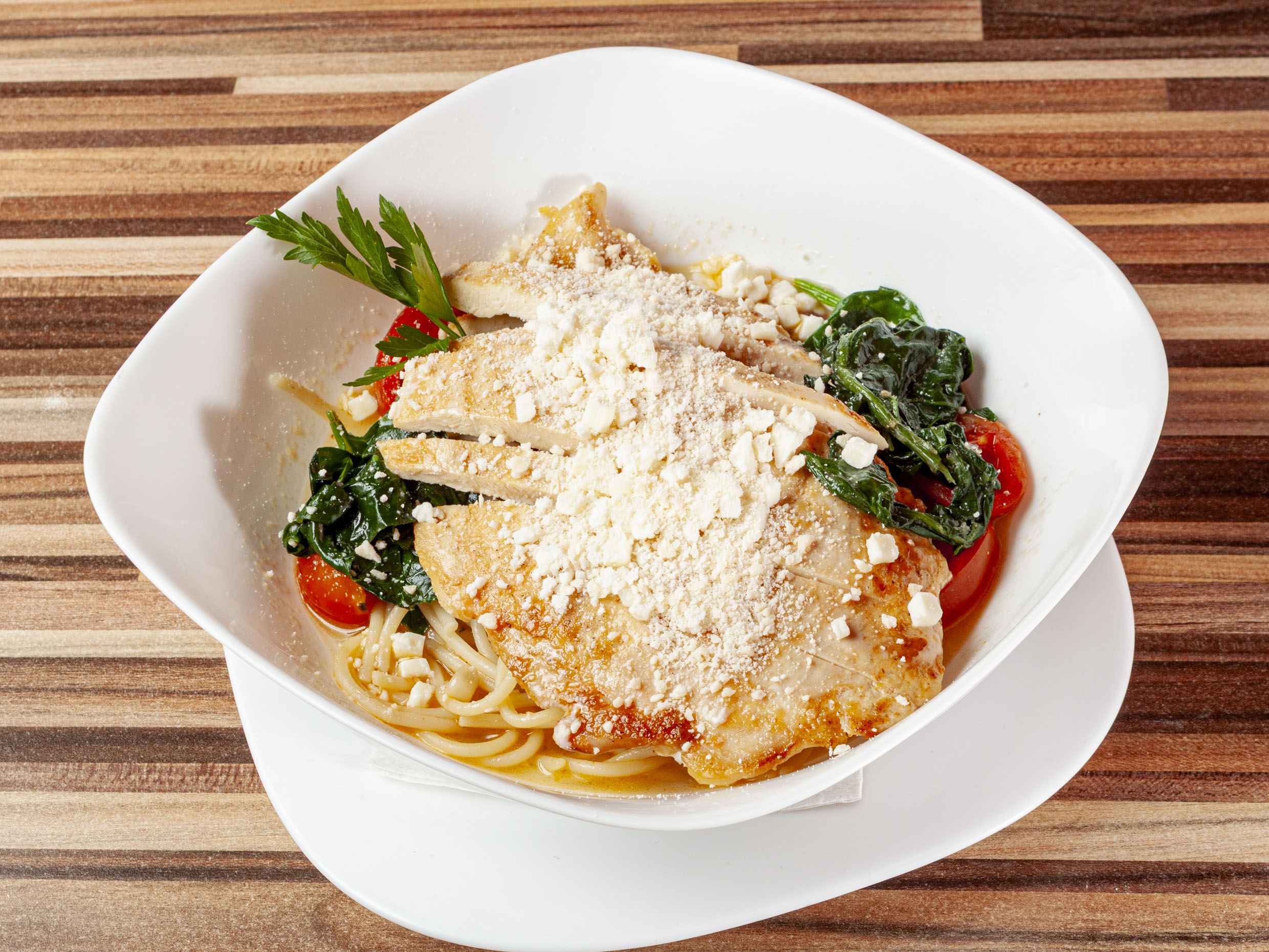 Spaghetti con hongos, jitomate, espinaca con salsa de queso parmesano y tiras de pechuga asada.