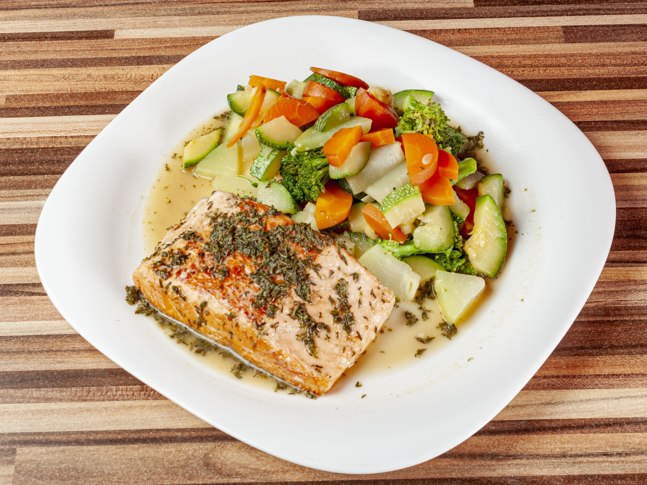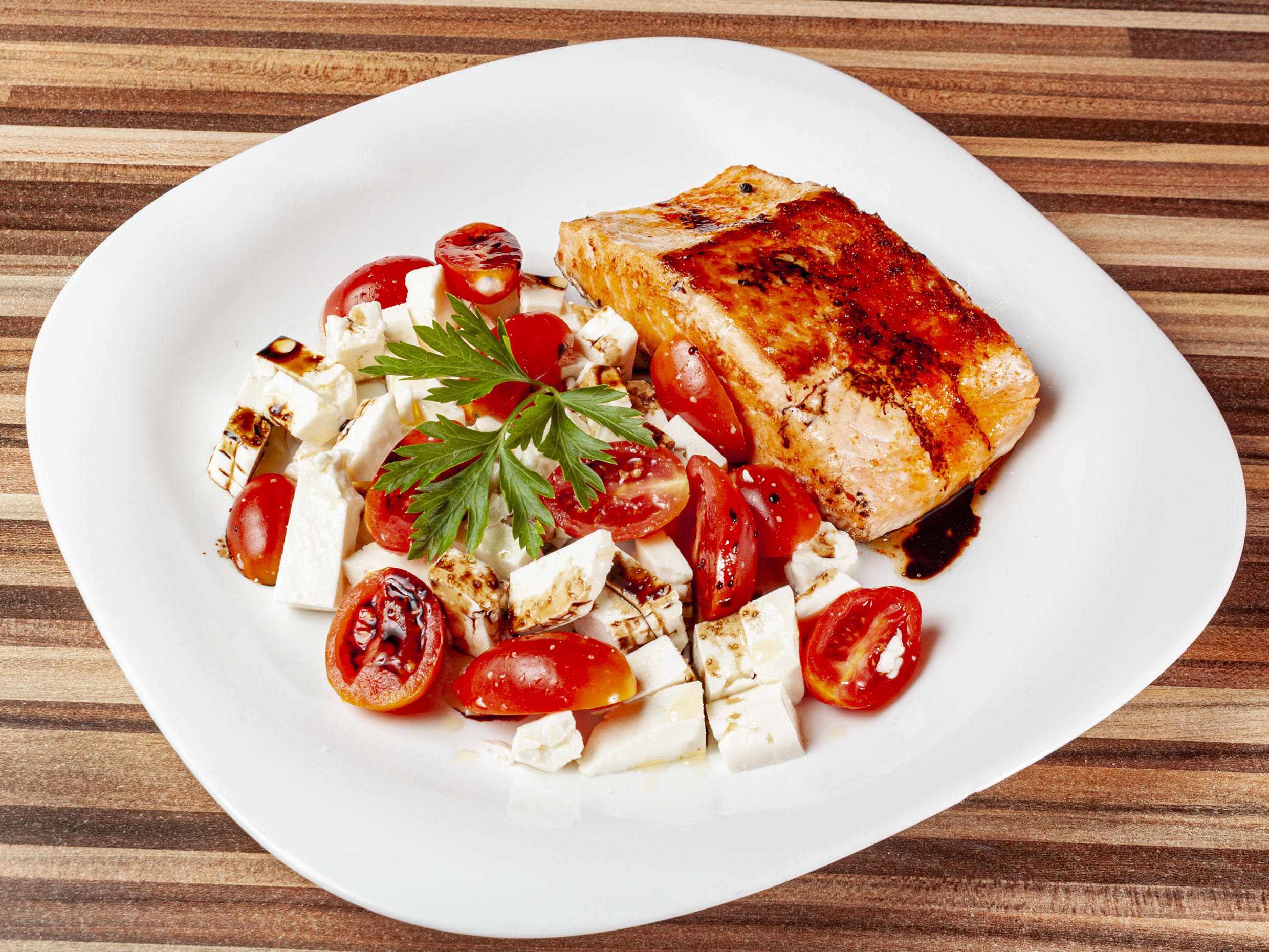 Salmón asado a la parrilla, acompañado de rodajas de jitomate fresco con rodajas de queso natural con vinagre balsámico, aceite de olivo y un toque de orégano.