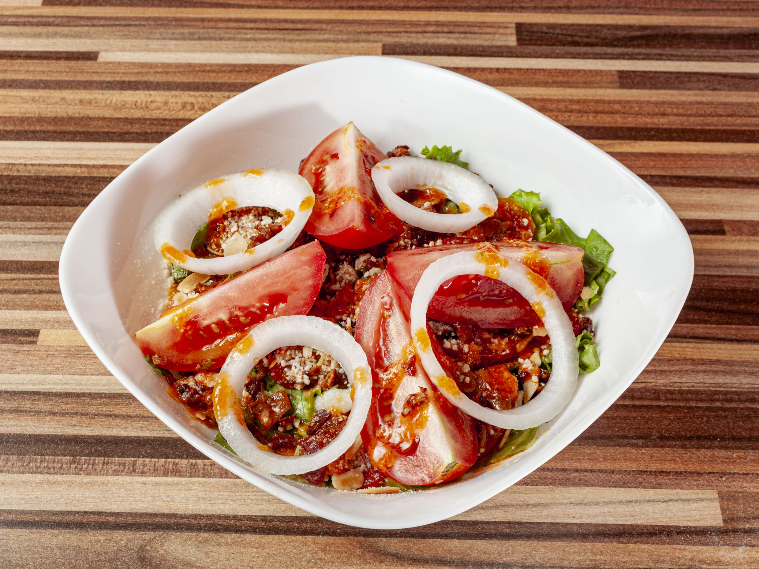 Combinación de lechugas, cebolla, jitomate y tocino, bañado con vinagreta.