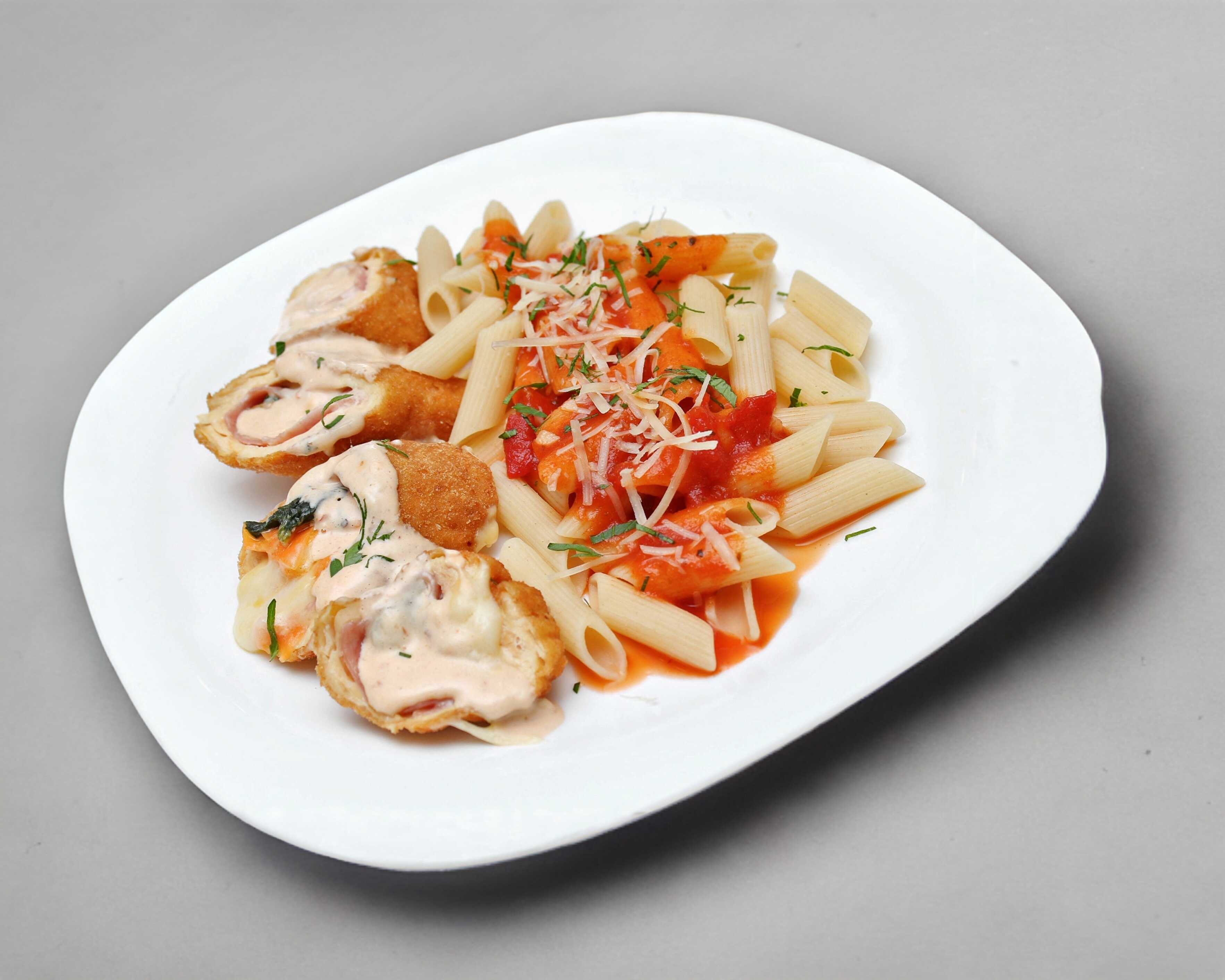 Pechuga rellena de jamón, queso, espinaca y zanahoria bañada con salsa cremosa de chipotle con pasta al pomodoro.