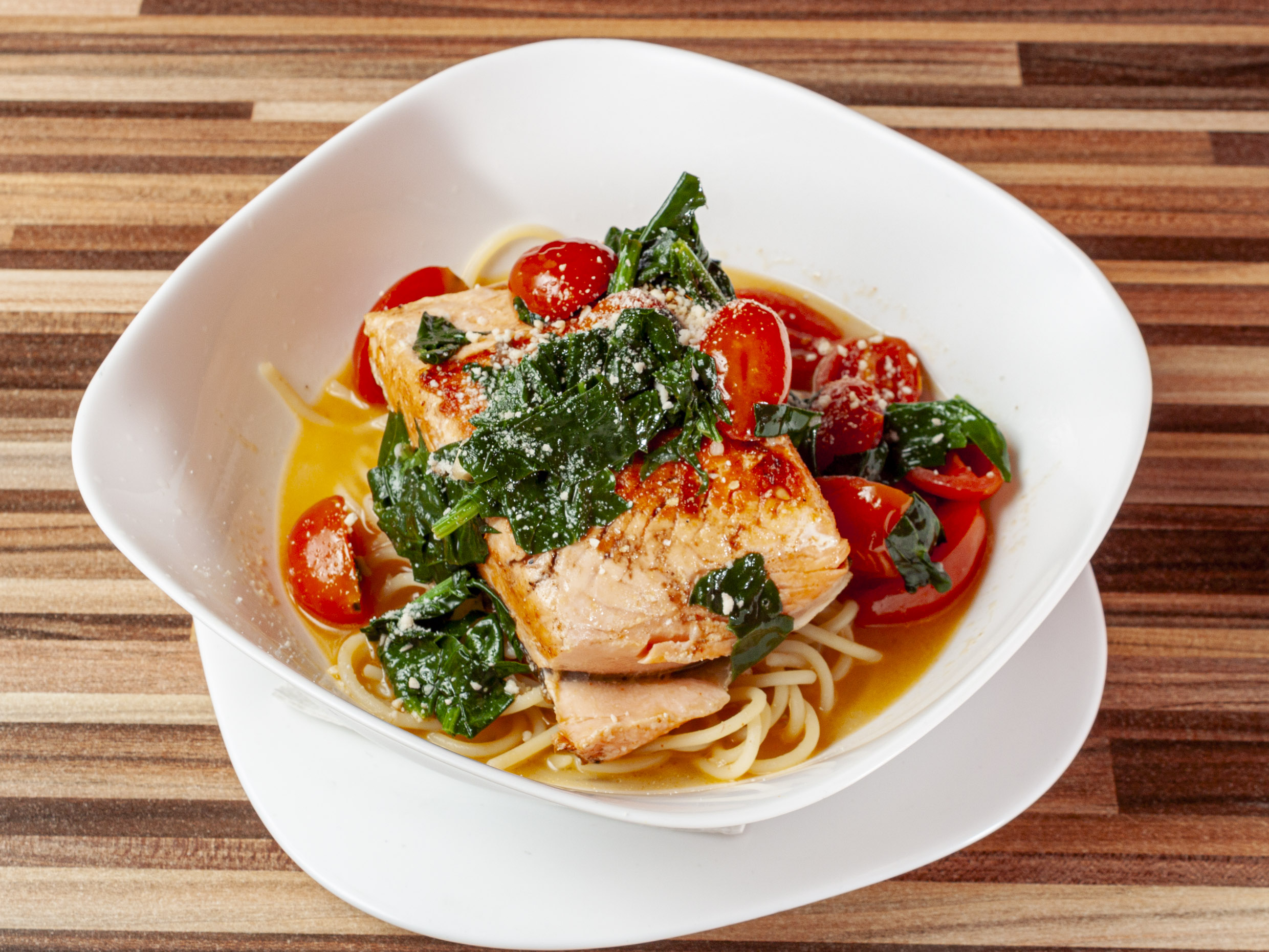 Salmón asado servido sobre una cama de pasta, bañado con salsa a la mantequilla al limón con espinacas y cubitos de jitomate.