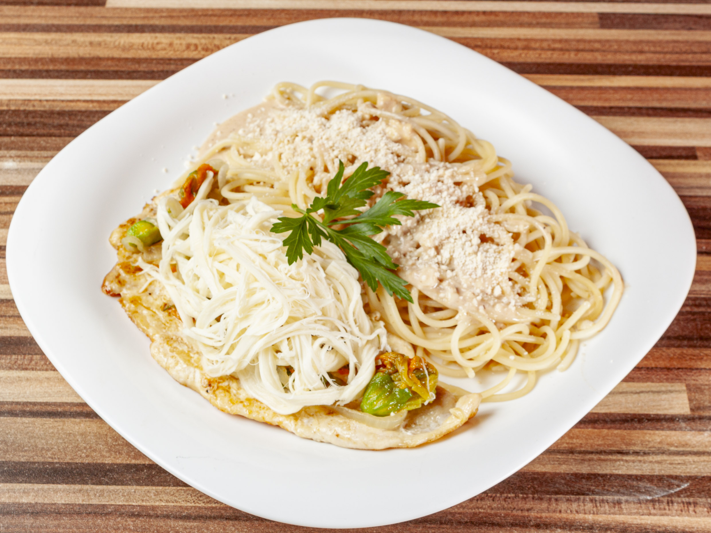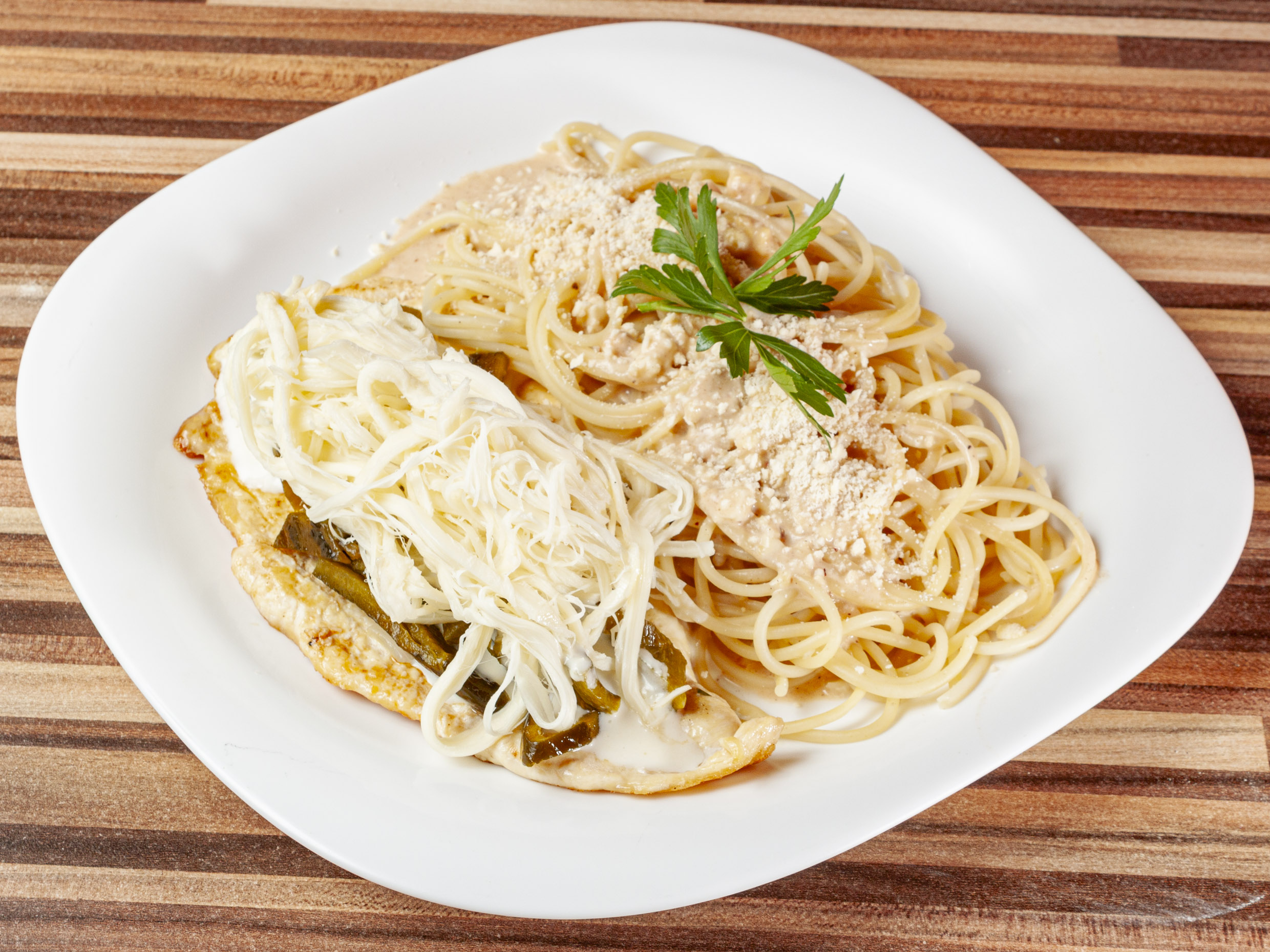 Pechuga con rajas, queso Oaxaca, acompañada de pasta en salsa de flor de calabaza.