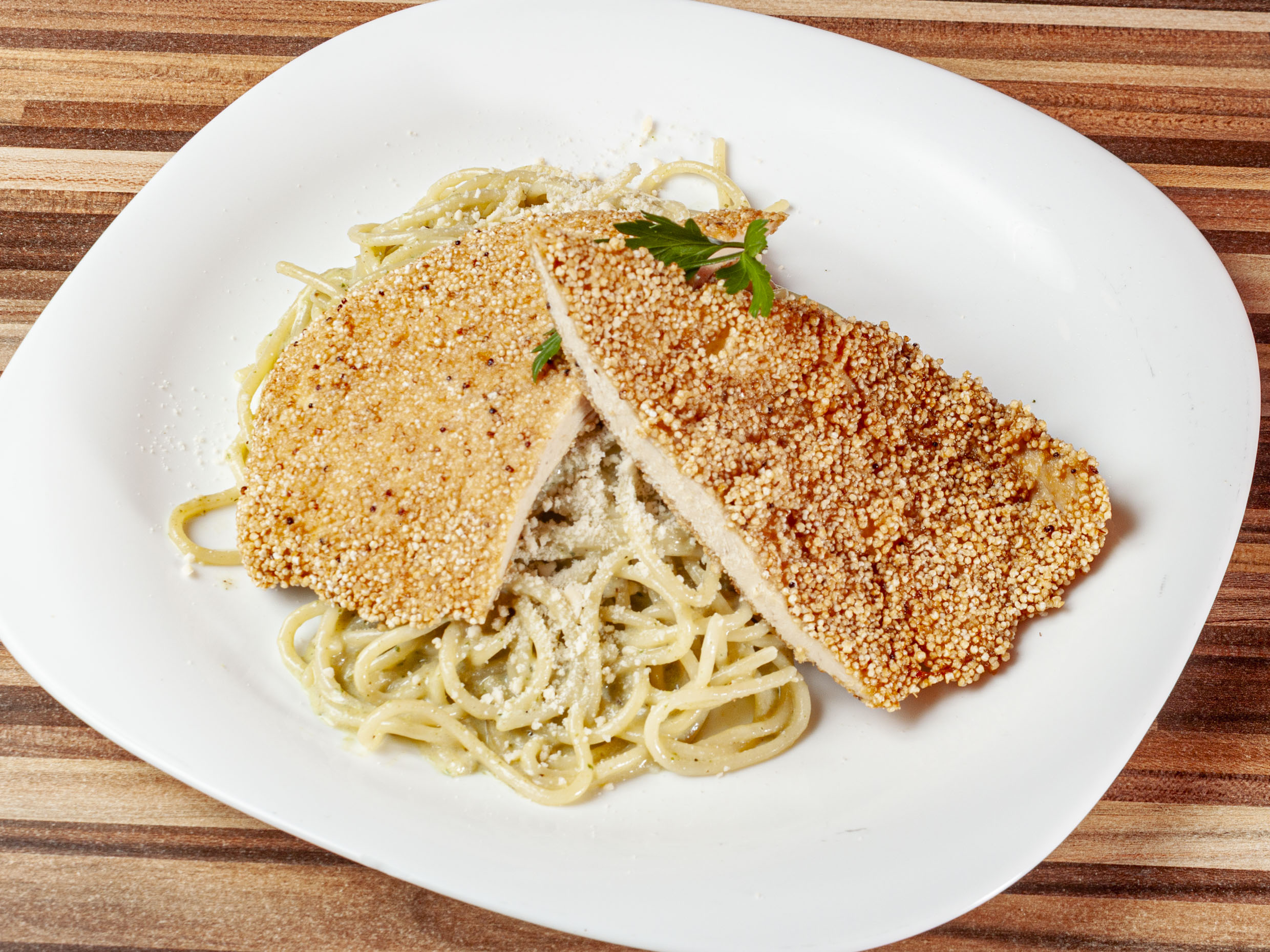Pechuga empanizada con amaranto servida sobre una pasta con salsa al pesto.