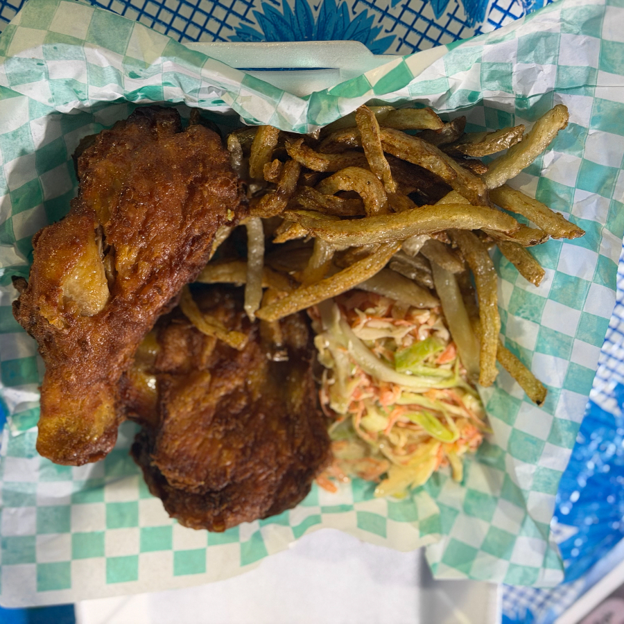 Dos piezas de pollo frito tipo broaster, papas fritas y ensalada