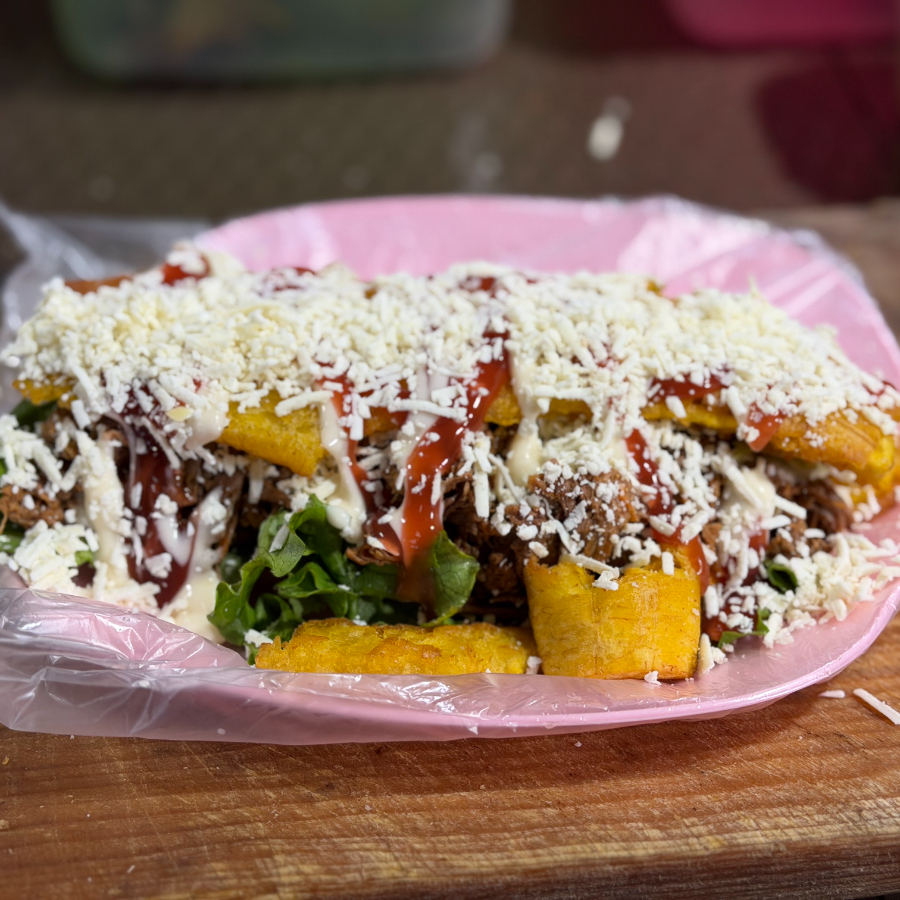 Platano macho frito, carne mechada, pollo, lechuga, jitomate, queso, capsu, aderezo