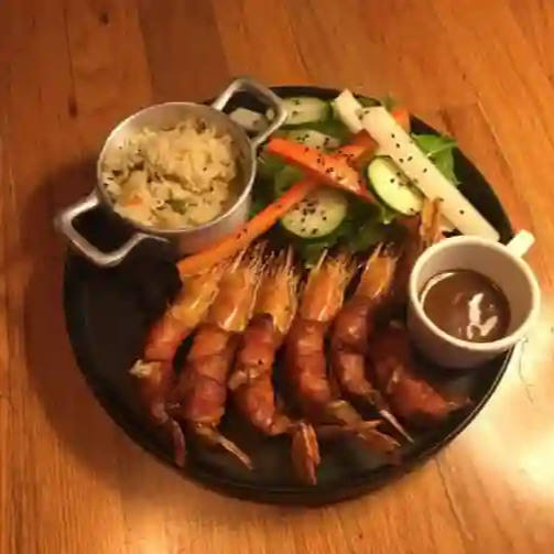 7 Camarones rellenos de Philadelphia, envueltos en tocino, acompañados de arroz y ensalada.