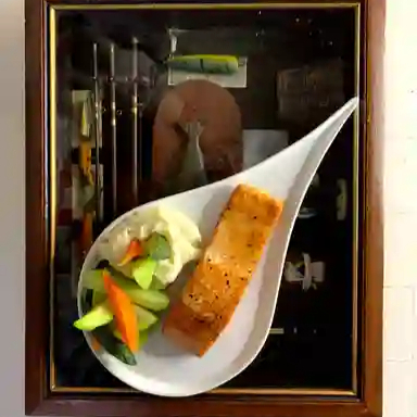Salmón 200 g bañado en salsa de cilantro, acompañado de puré de papa y verduras al vapor.