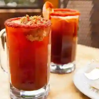 Copa de cerveza con clamato, pepino, camarón, salsas negras y jugo de limón, 435 ml.