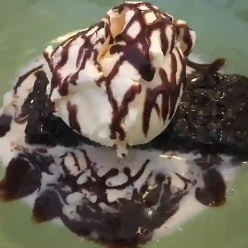 Brownie tibio con helado de vainilla y salsa de chocolate.