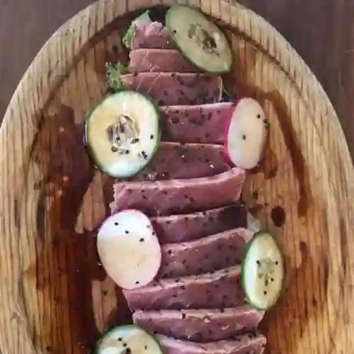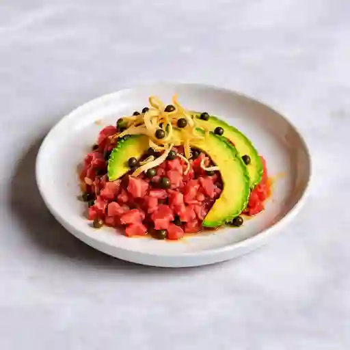 Atún picado con salsa especial de soya, aguacate, cebolla frita y alcaparras.
