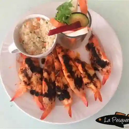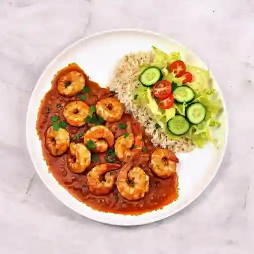 7 Camarones grandes al mojo de ajo, ajillo o diabla, acompañados de arroz y ensalada.