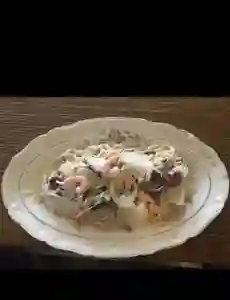Spaghetti cremoso, con camarón, mejillones, pulpo, calamar, vinos rosados y queso parmesano.