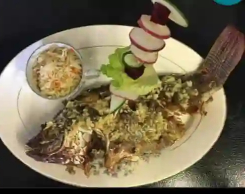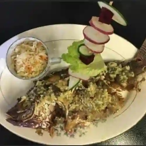 Mojarra 800 g, frita o al mojo de ajo, acompañada de arroz y ensalada.