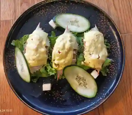 Caparazones rellenos de estofado de jaiba, con toque de vino blanco y gratinado con queso gruyère, acompañado de ensalada.