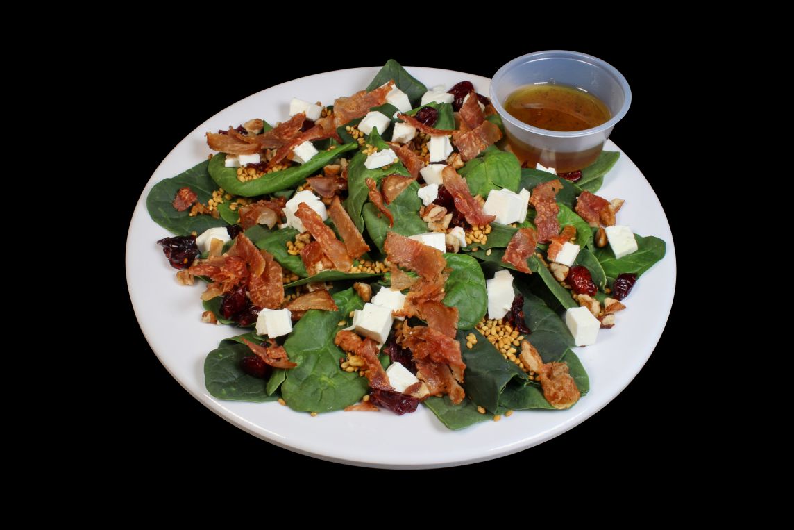 Tiras de espinacas con tocino, queso panela, espolvoreado con ajonjolí garapiñado