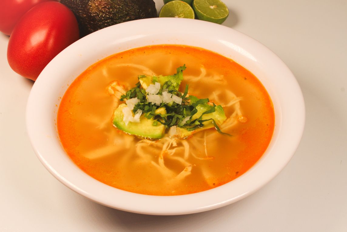 Caldo de pollo servido con arroz, pollo deshebrado, rebanada de aguacate y guarnición de cilantro y cebolla