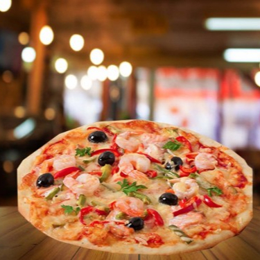 Pizza con camarón, salmón, calamar, mejillón, cebolla, vino blanco y hojuela de chile, 8 porciones.