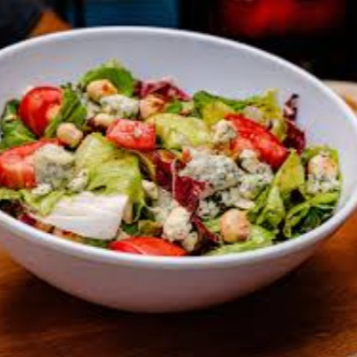 Mix lechuga de temporada con tocino horneado, nuez, jitomate en cubos, queso gorgonzola y vinagreta italiana.