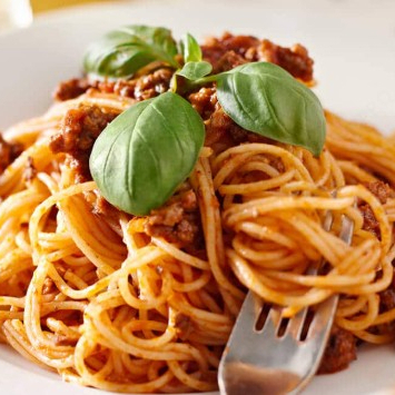 Espagueti al dente con salsa boloñesa, perejil espolvoreado y queso parmesano.