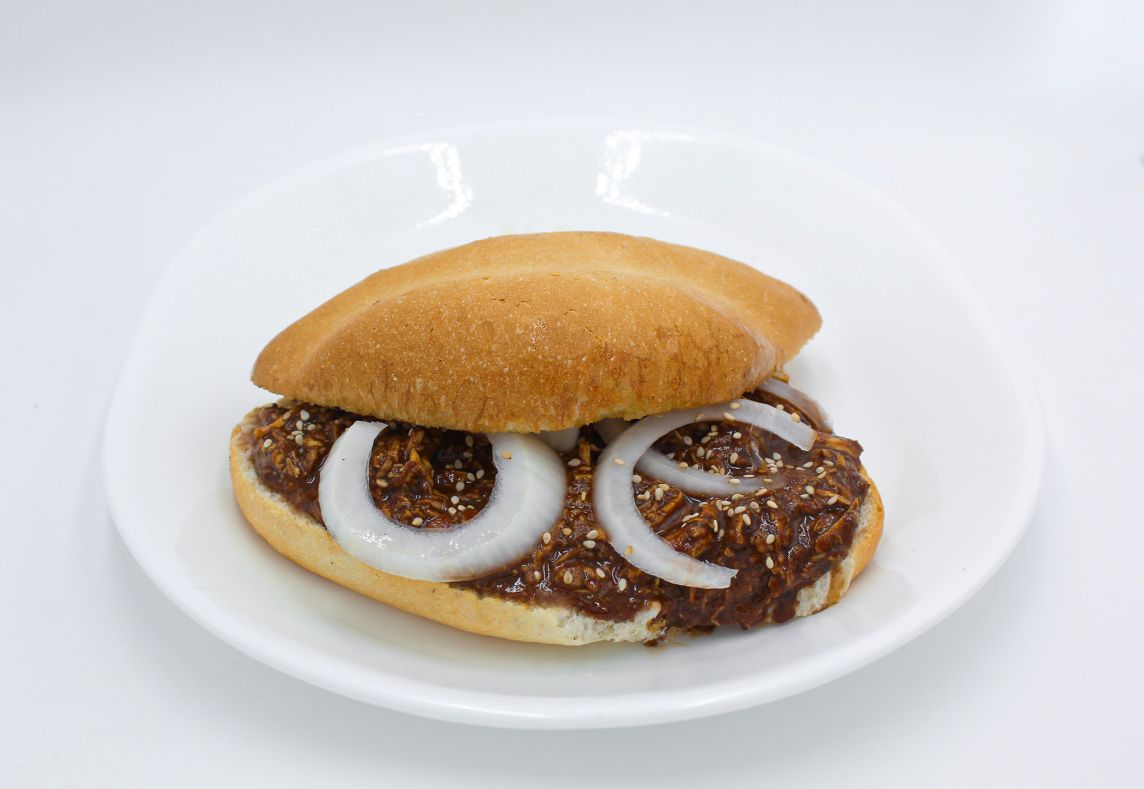 120 de pollo deshebrado en mole poblano preparado, cebolla bola, mantequilla, frijoles y ajonjoli tostado