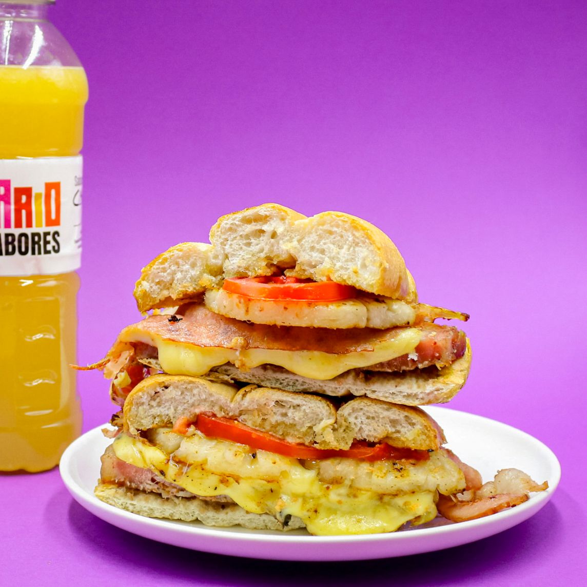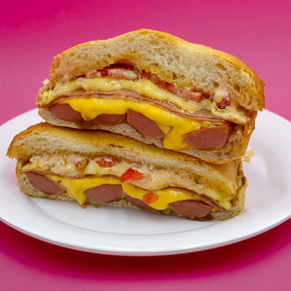 100gr de salchica de pavo, queso americano, jamón de pavo, 80gr de queso gouda, jitomate, mantequilla y aderezo de la casa