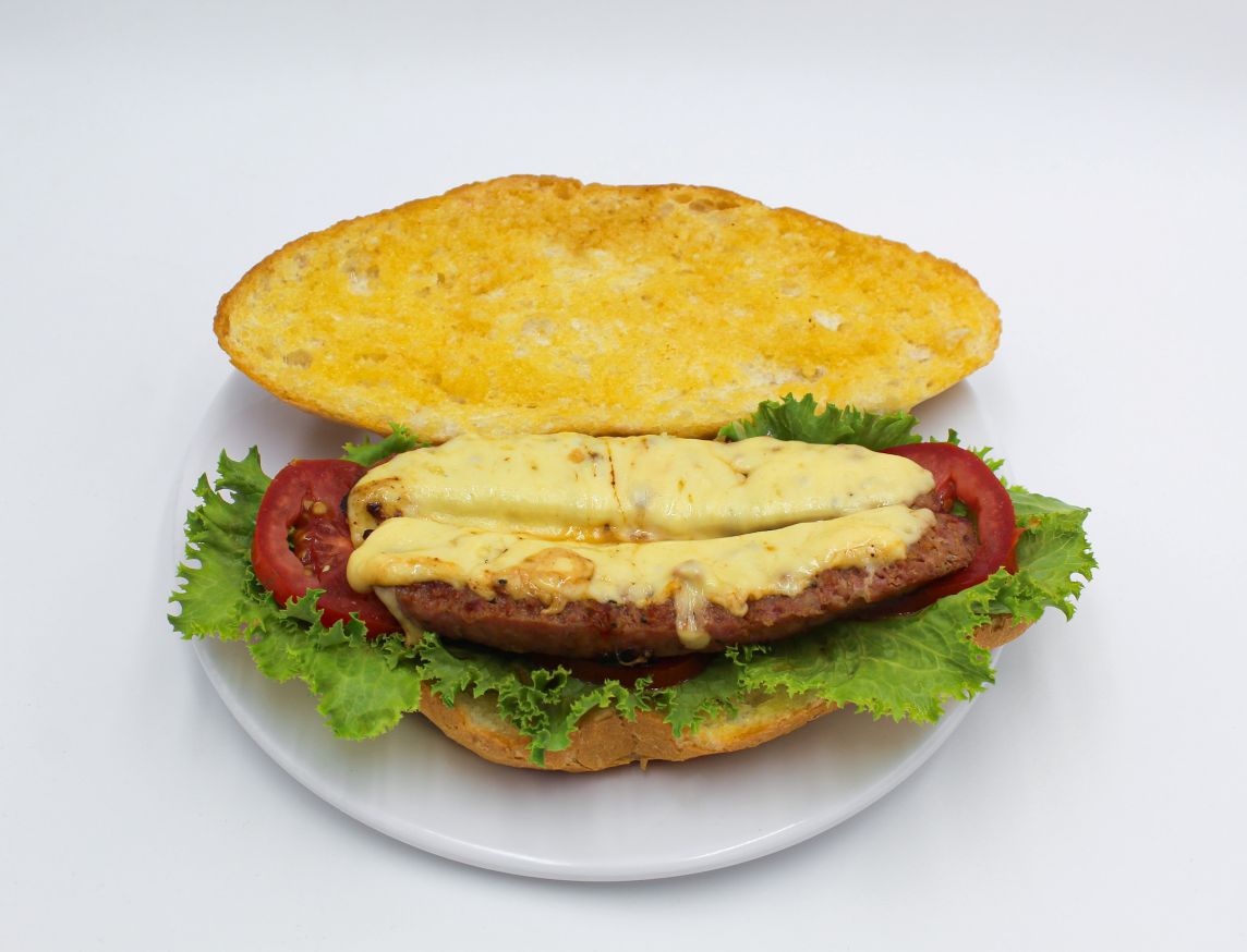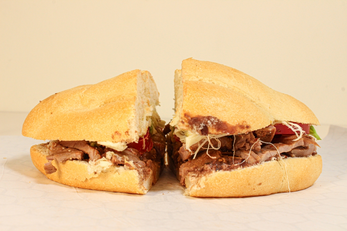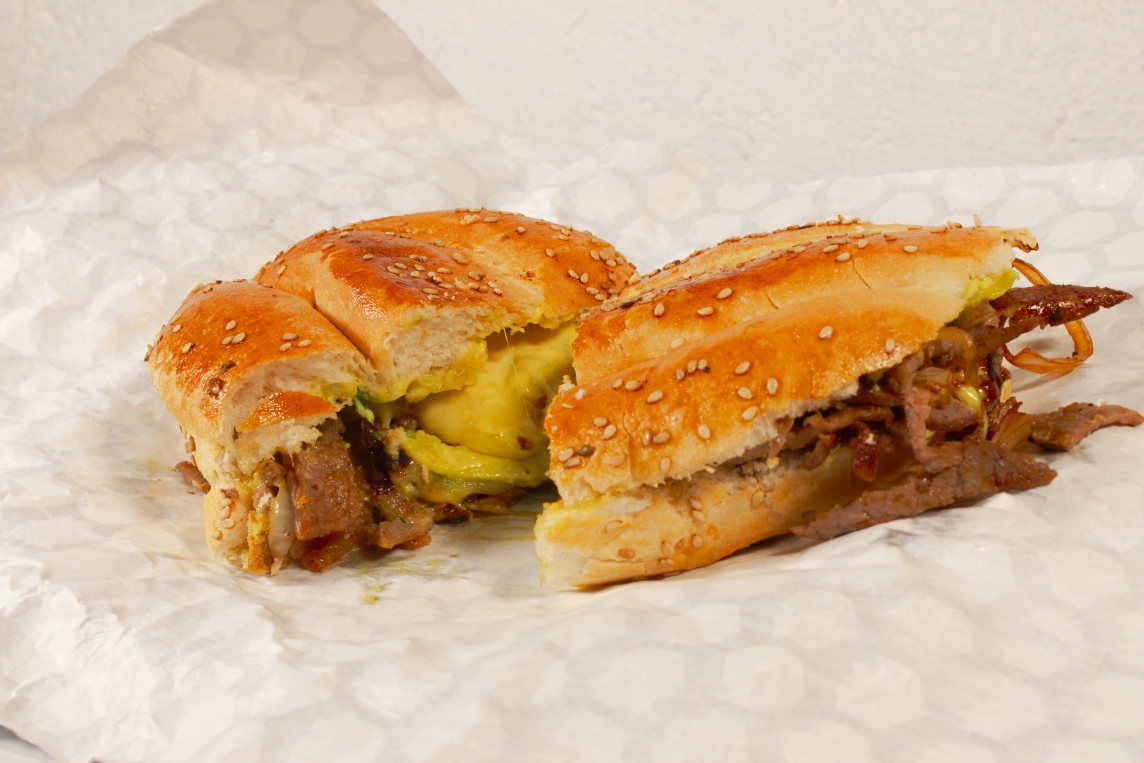 150grs de bistec de res con cebolla fileteada, 60grs de queso gouda, telera untada con aderezo de mostaza y aguacate