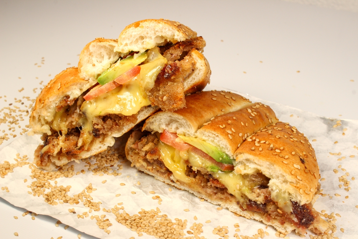 150 grs de milanesa (pollo o res), con mantequilla o mayonesa, frijoles, jitomate y rebanadas de aguacate.
