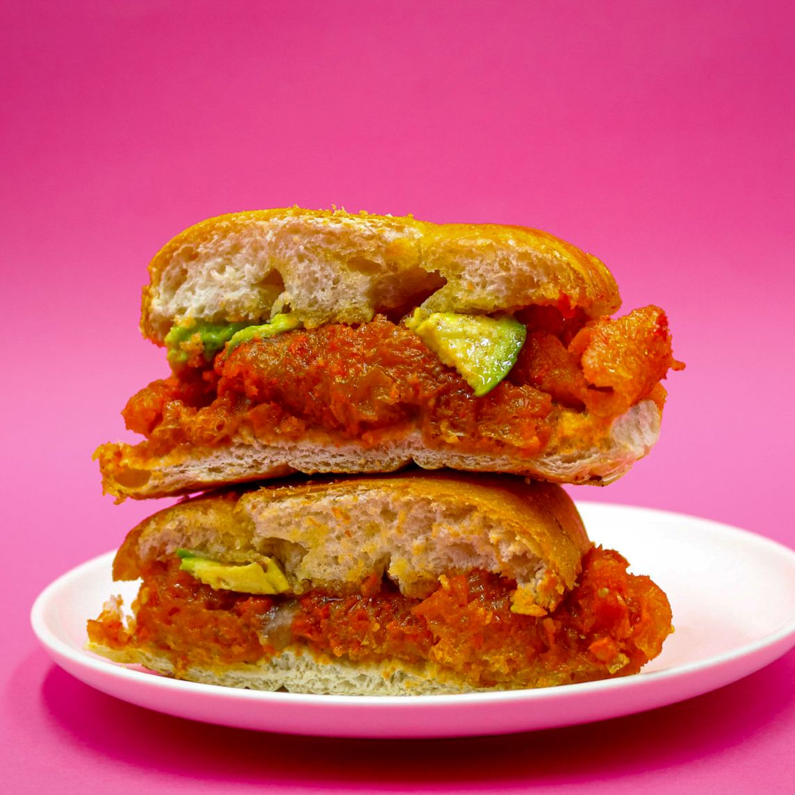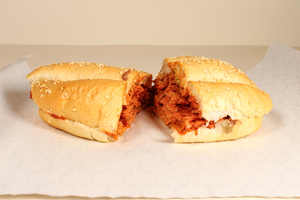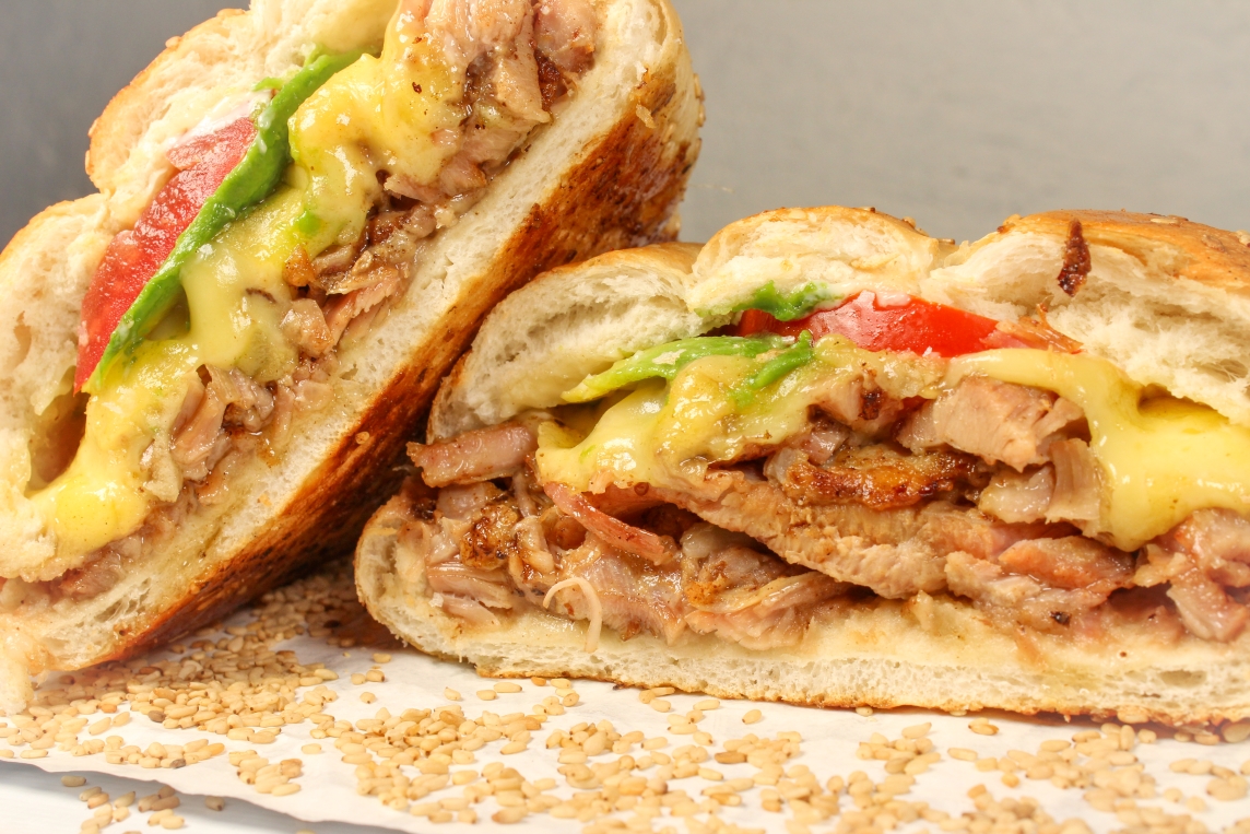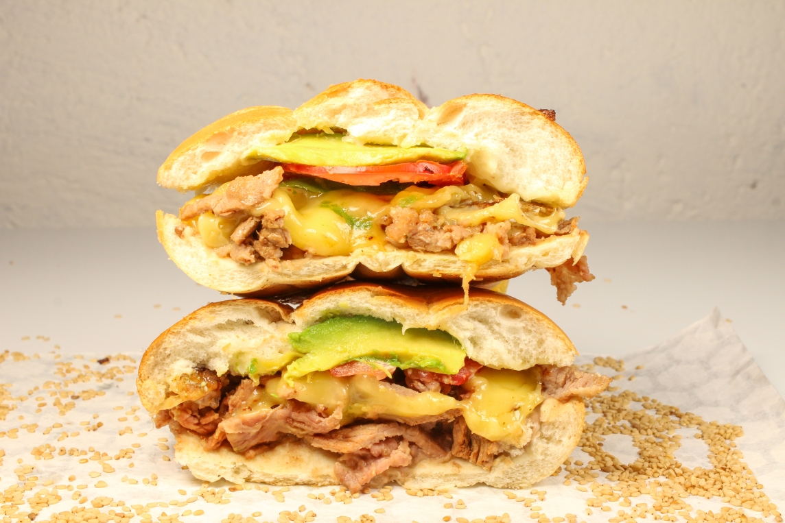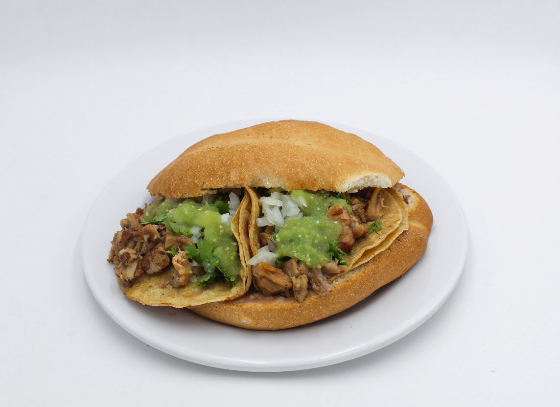 150grs de pierna de cerdo adobada, telera untada a elegir con mantequilla o mayonesa, frijoles, jitomate y aguacate