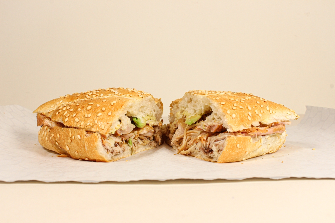 150grs de pierna de cerdo, telera untada a elegir con mantequilla o mayonesa, frijoles, jitomate y aguacate