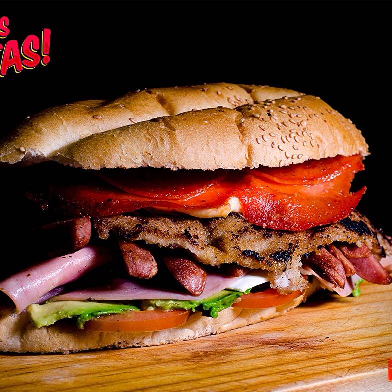 Torta de milanesa, pierna, salchicha tradicional, quesillo, aguacate, jitomate, cebolla, mayonesa, chiles y rajas o chipotle (especificar algún cambio).