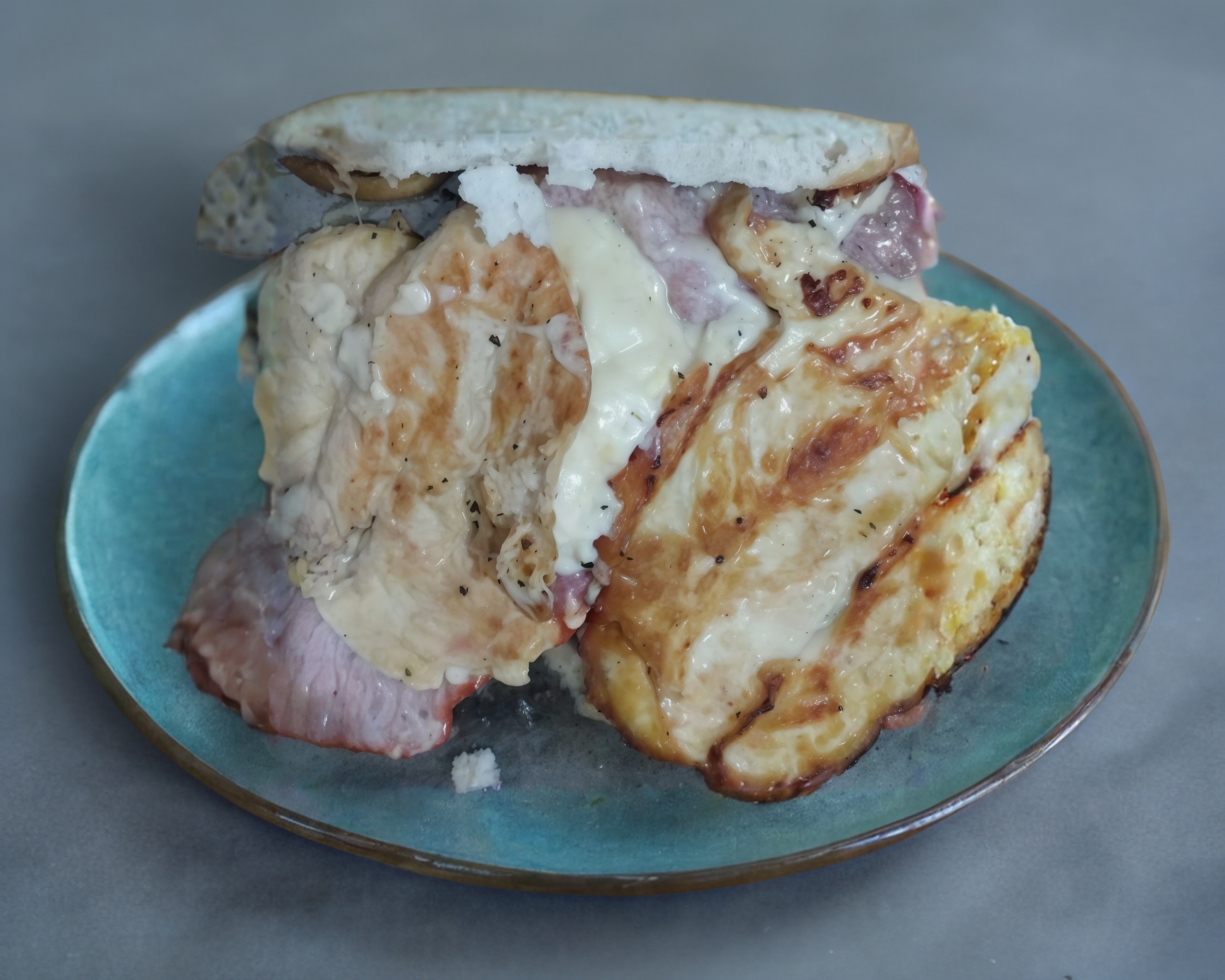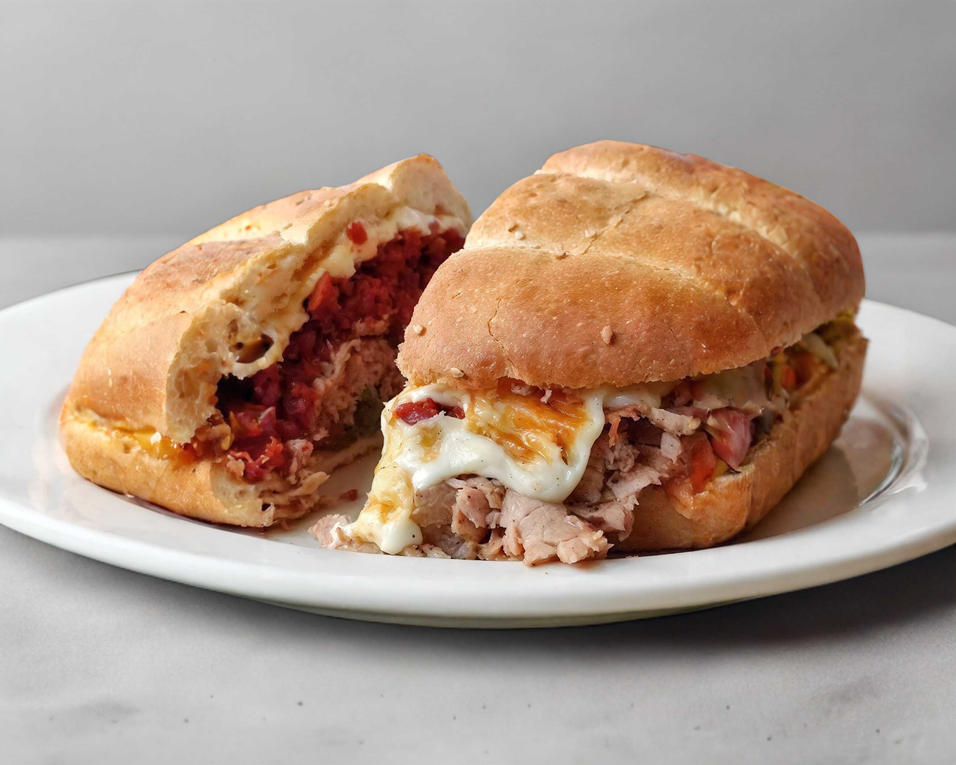 Torta gigante de milanesa de puerco con queso Oaxaca fundido.