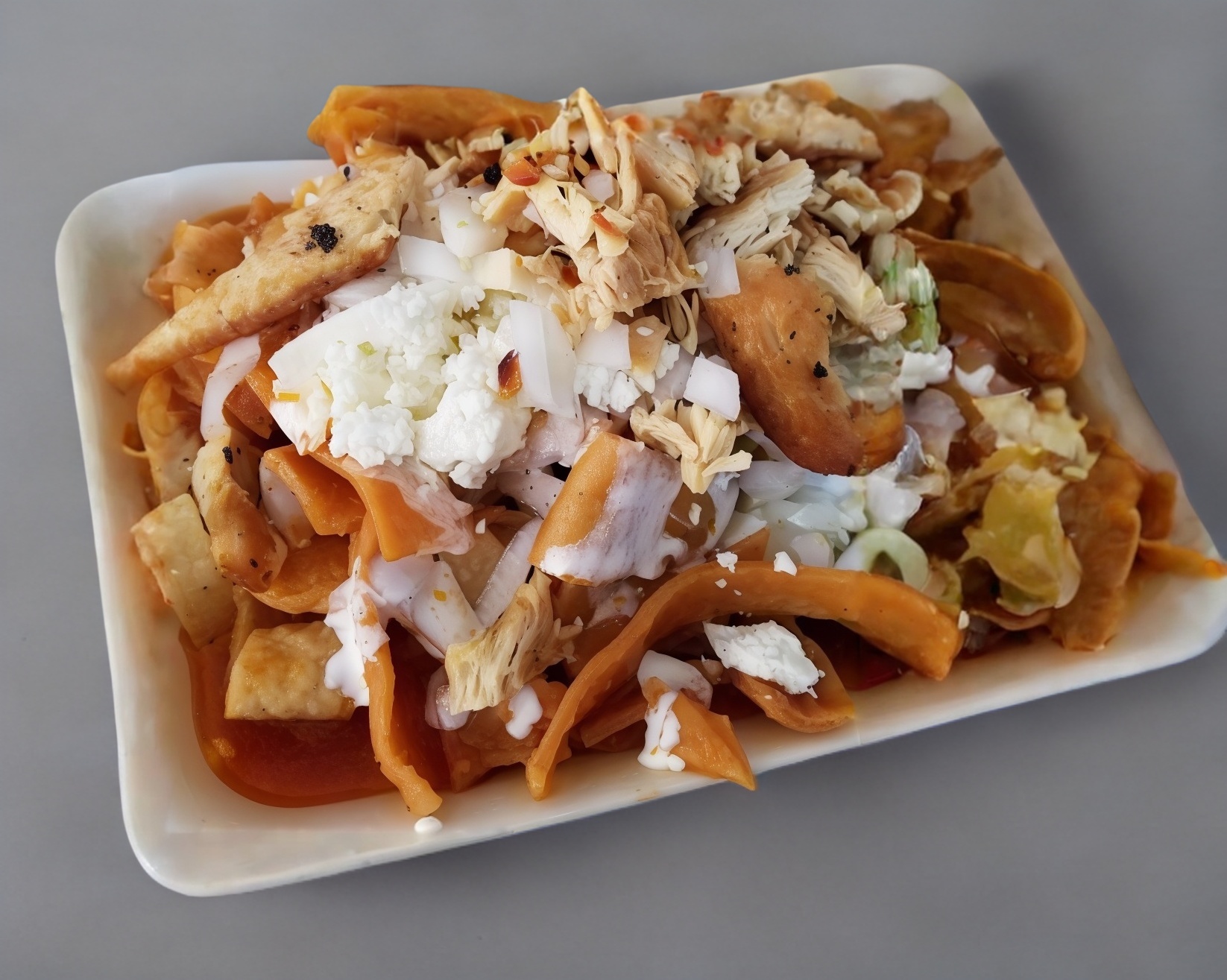 Torta con tortilla dorada en trocitos en salsa roja o verde, con queso, crema y proteína opcional a elegir.