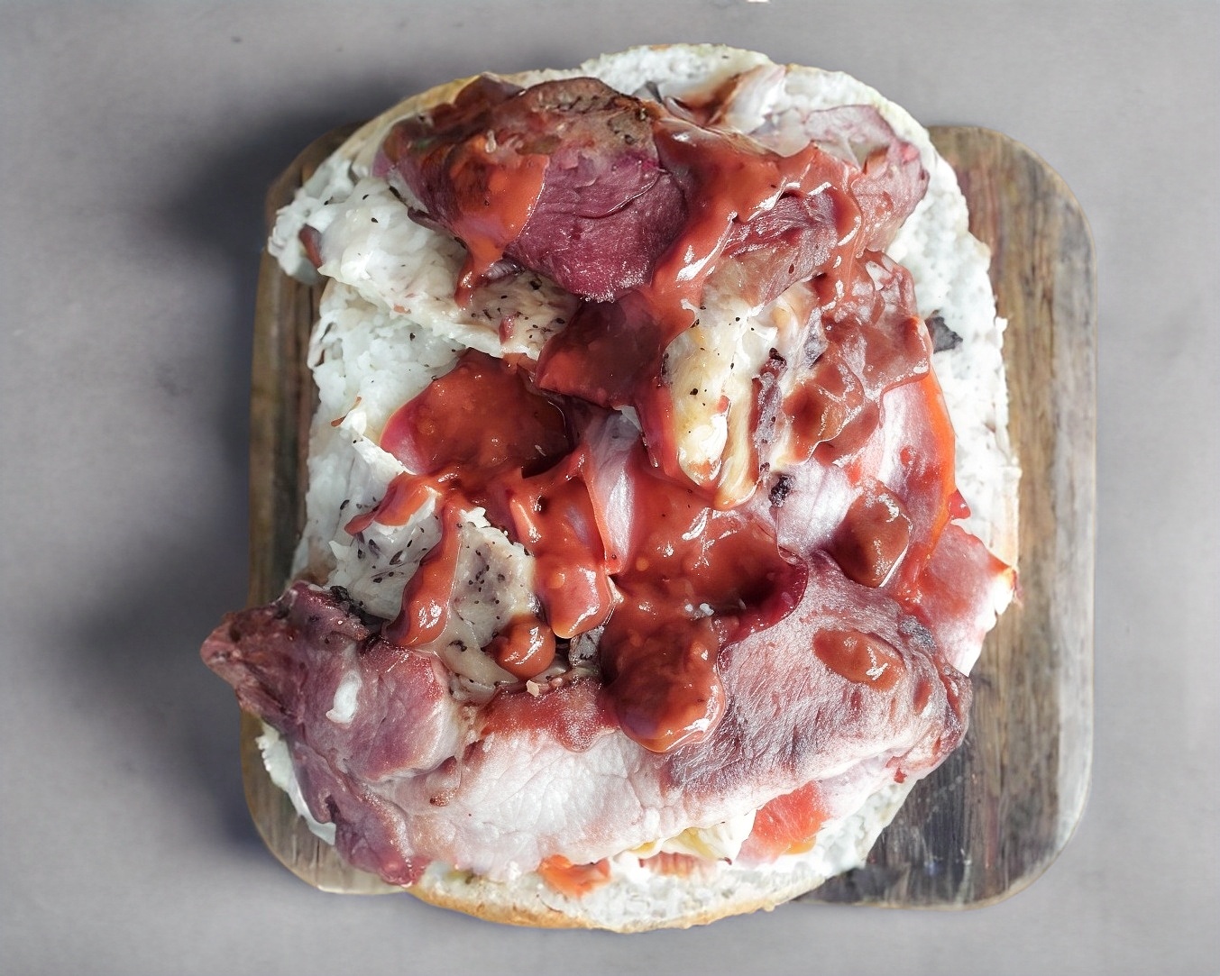 Pechuga de pollo, pierna española y chuleta ahumada de puerco,(mayonesa, frijolitos refritos, cebolla, aguacate, jitomate, picante)