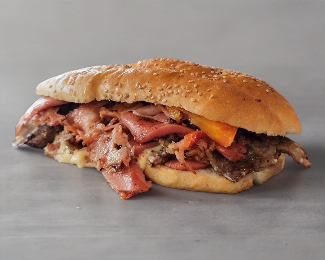 1 Pan tipo bollo con carne 100% de res molida preparada con la receta de la casa, jamon,queso amarillo🧀, queso Oaxaca🧀 y salchicha. (mayonesa, cebolla, jitomate, picante, cátsup y mostaza).