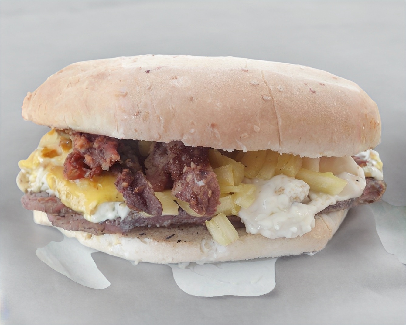 1 Pan tipo bollo con carne 100% de res molida preparada con la receta de la casa, jamón, queso amarillo, queso oaxaca y piña (mayonesa, cebolla, jitomate, picante, cátsup y mostaza).