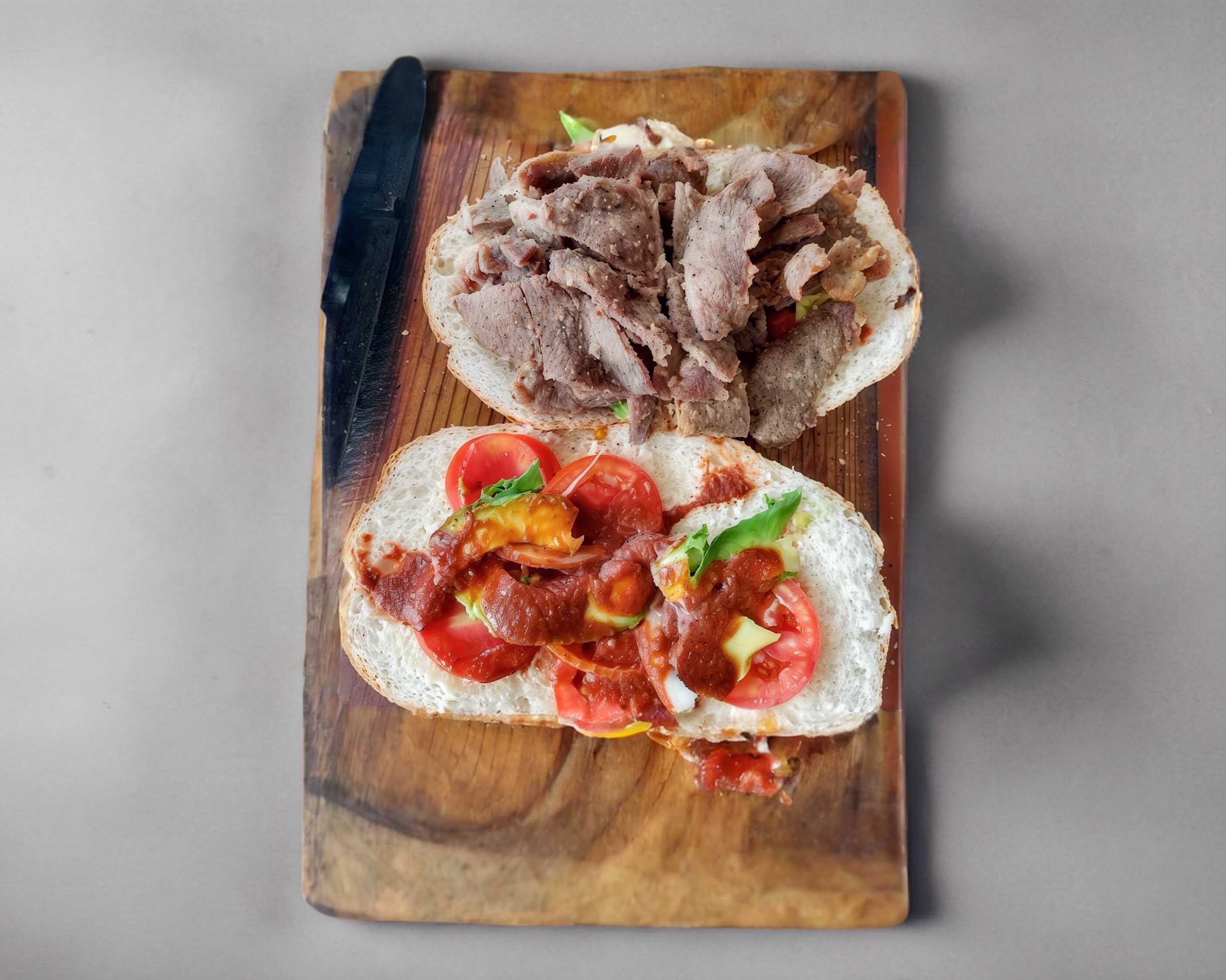 Milanesa 100% de res, pierna española y pechuga de pollo asada,(mayonesa, frijolitos refritos, cebolla, aguacate, jitomate, picante.)