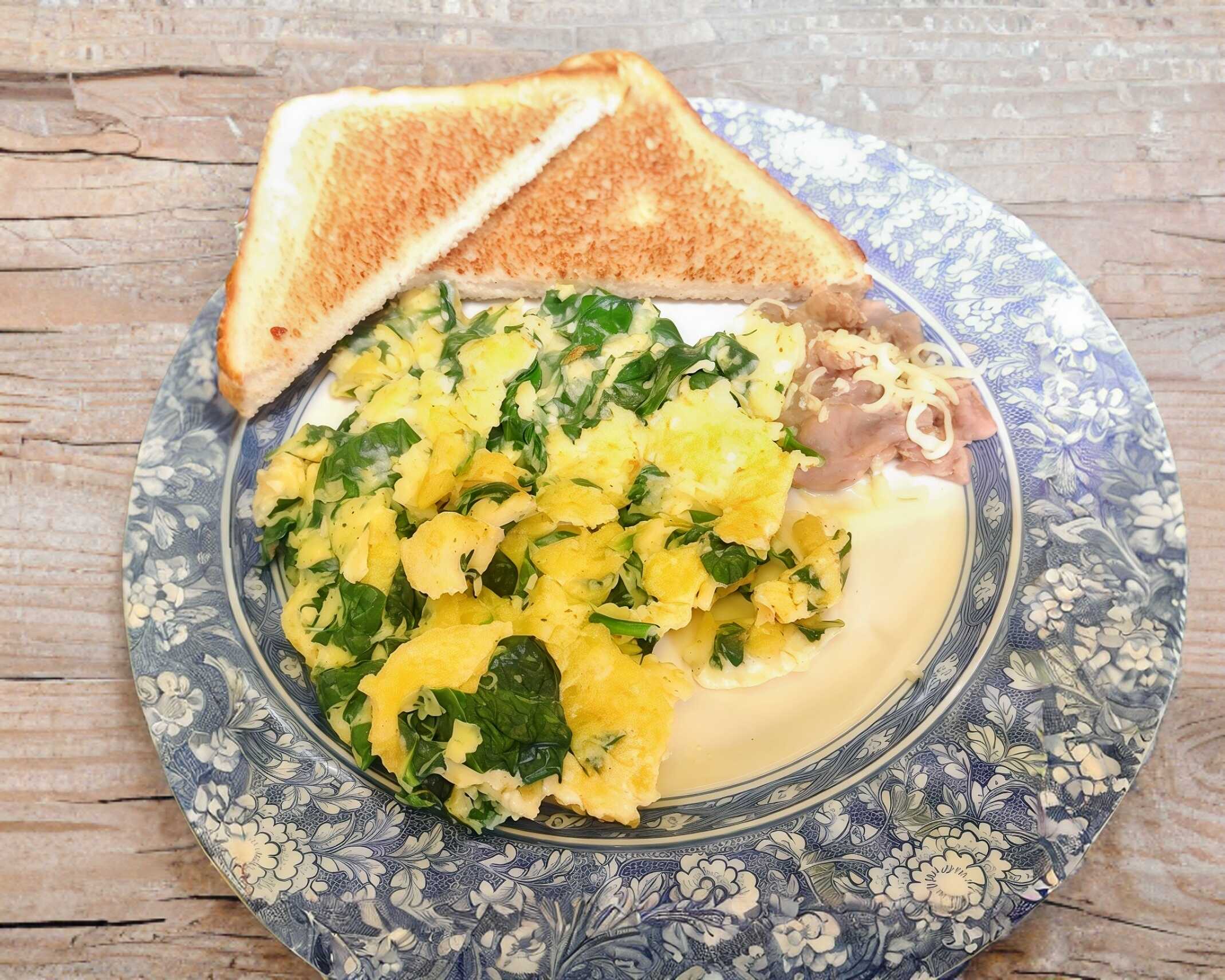 Dos piezas de huevo revuelto con espinacas y toque de queso manchego